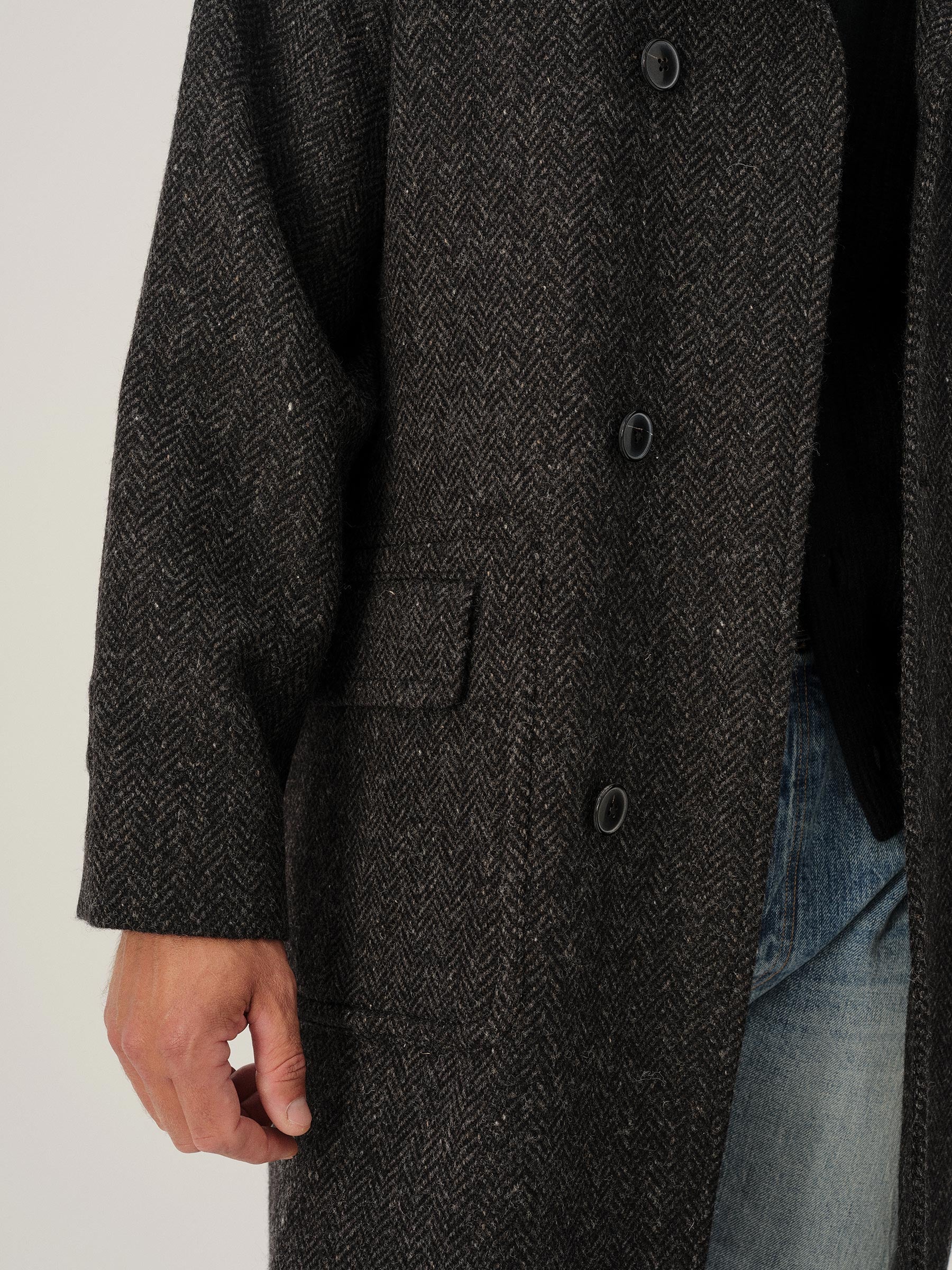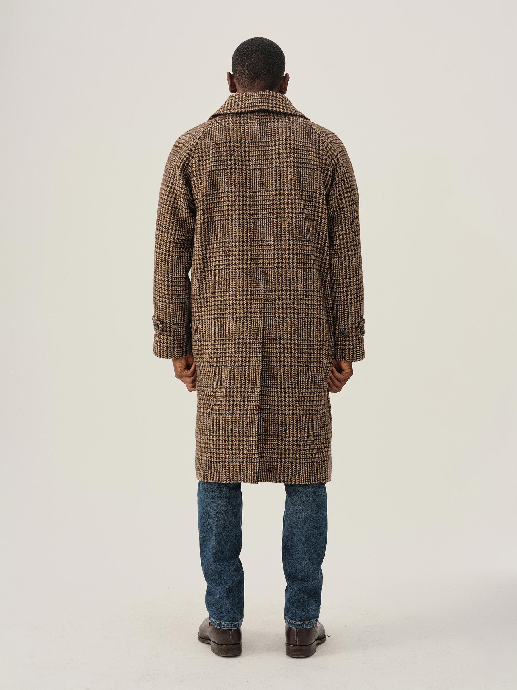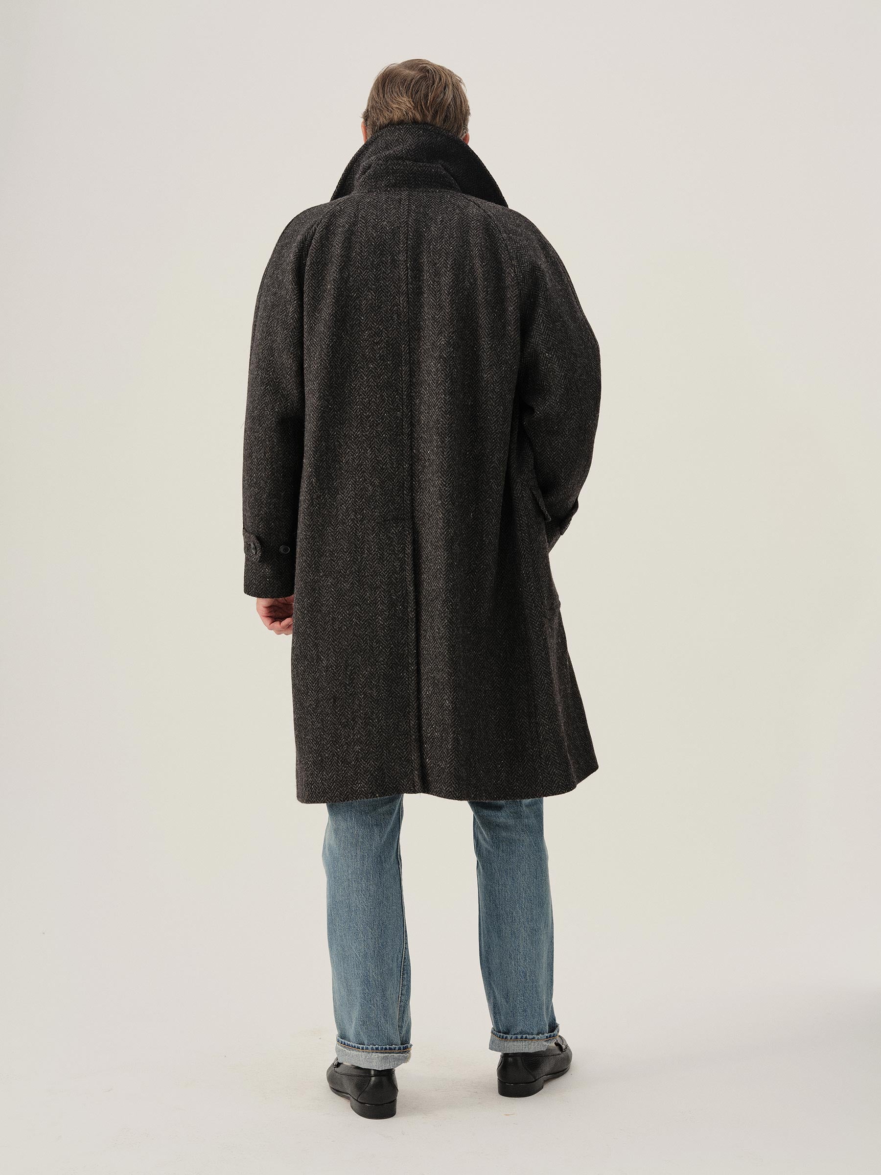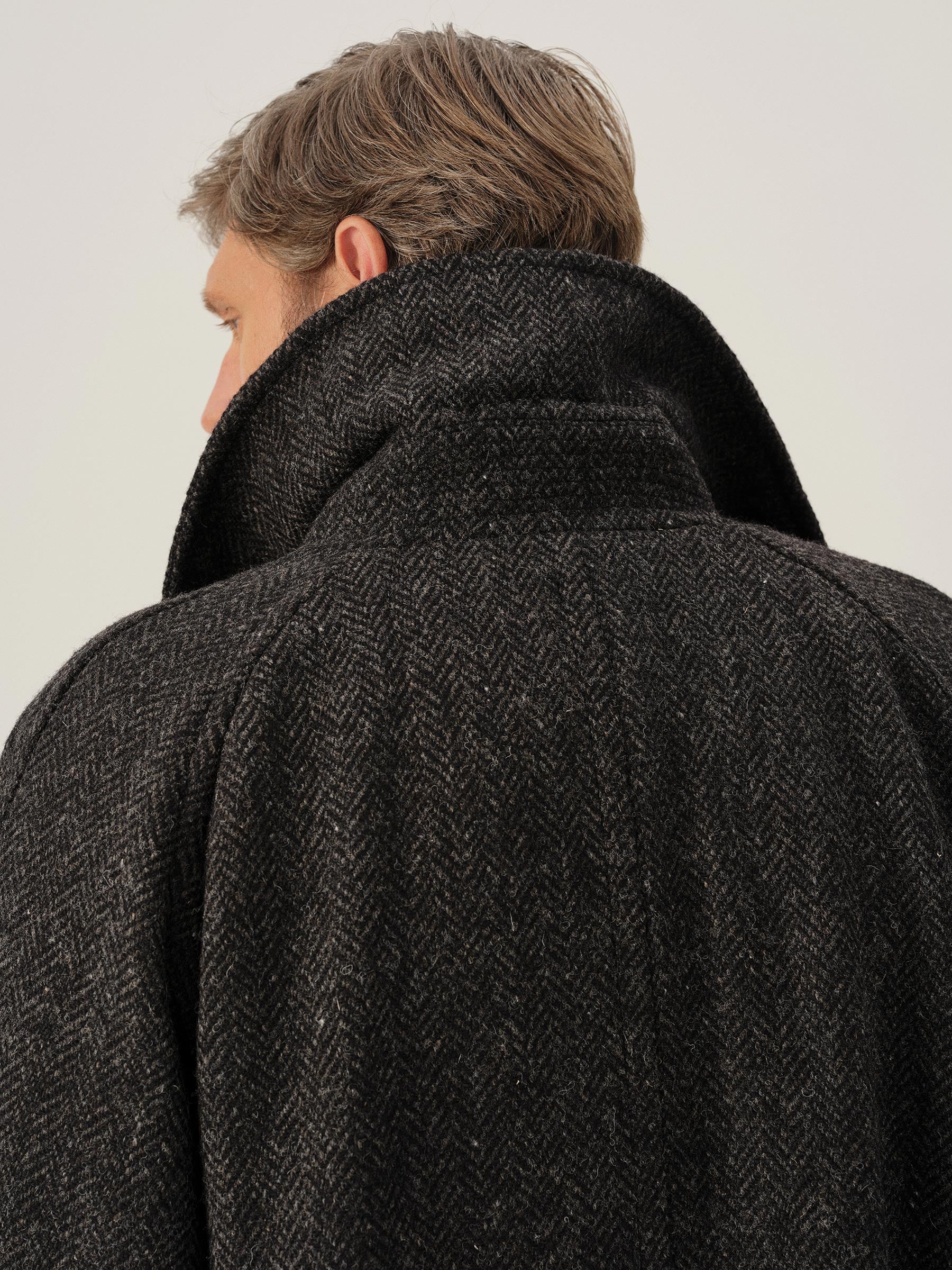 Raglan-sleeved overcoat in handwoven Donegal tweed.