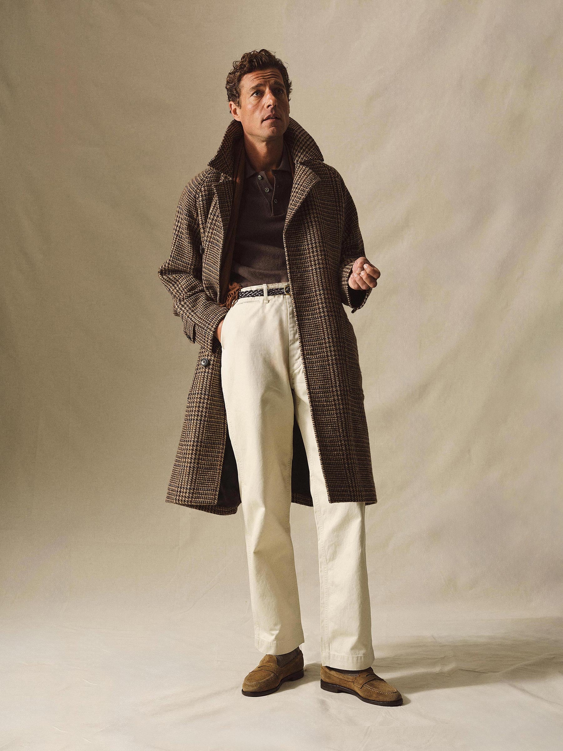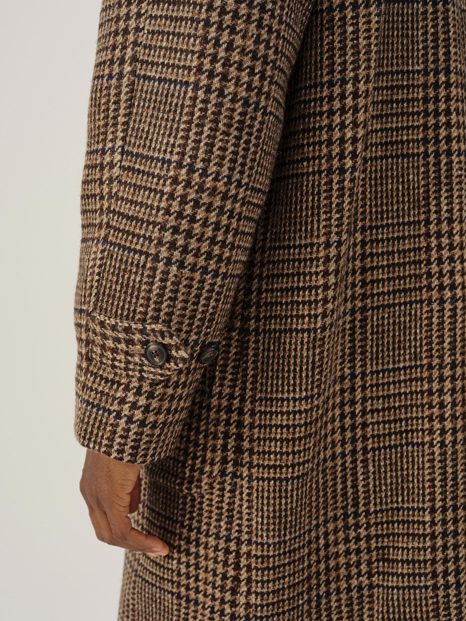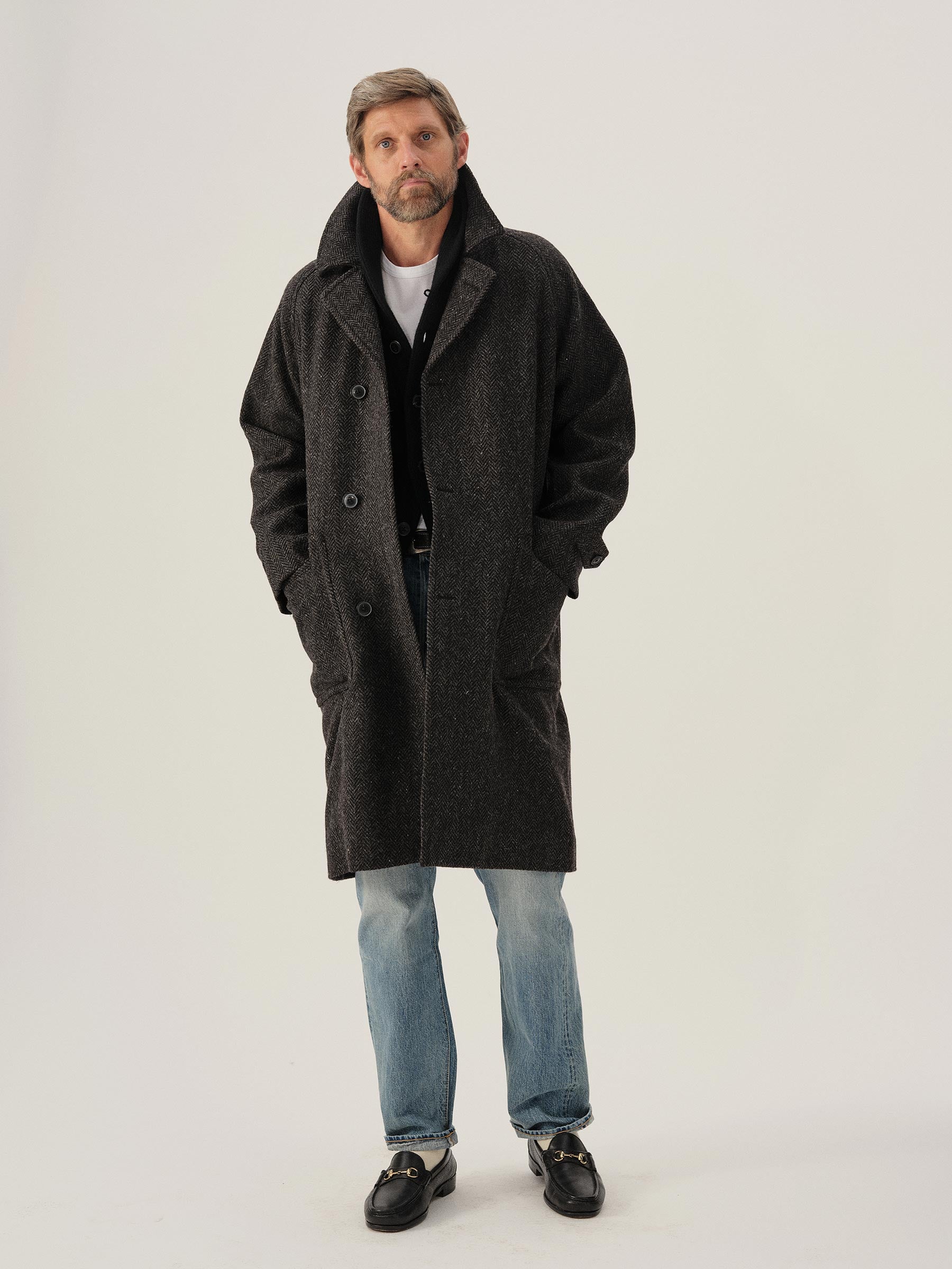 Raglan-sleeved overcoat in handwoven Donegal tweed.