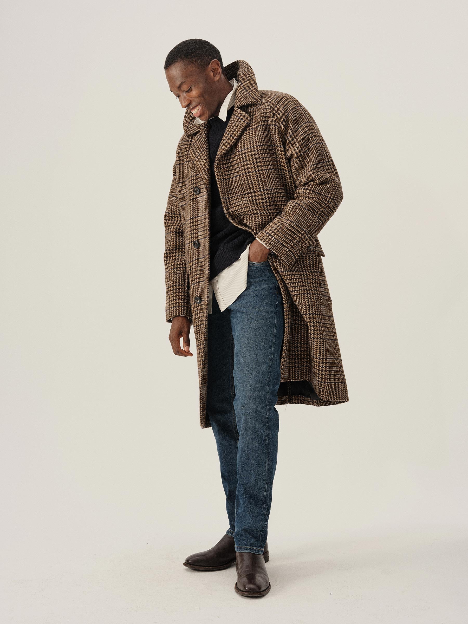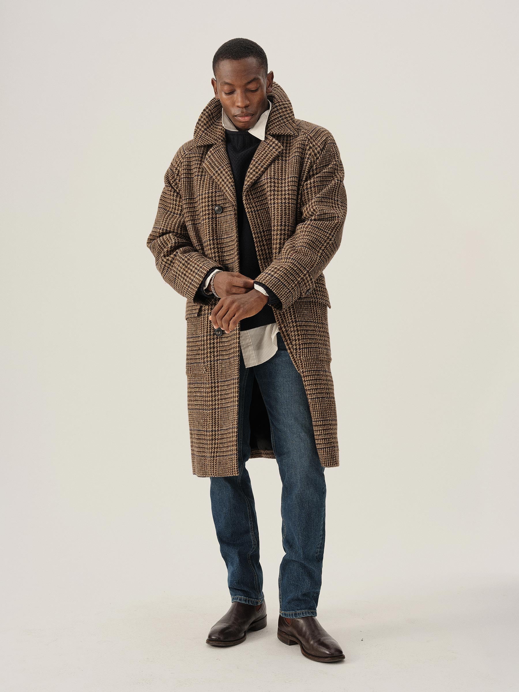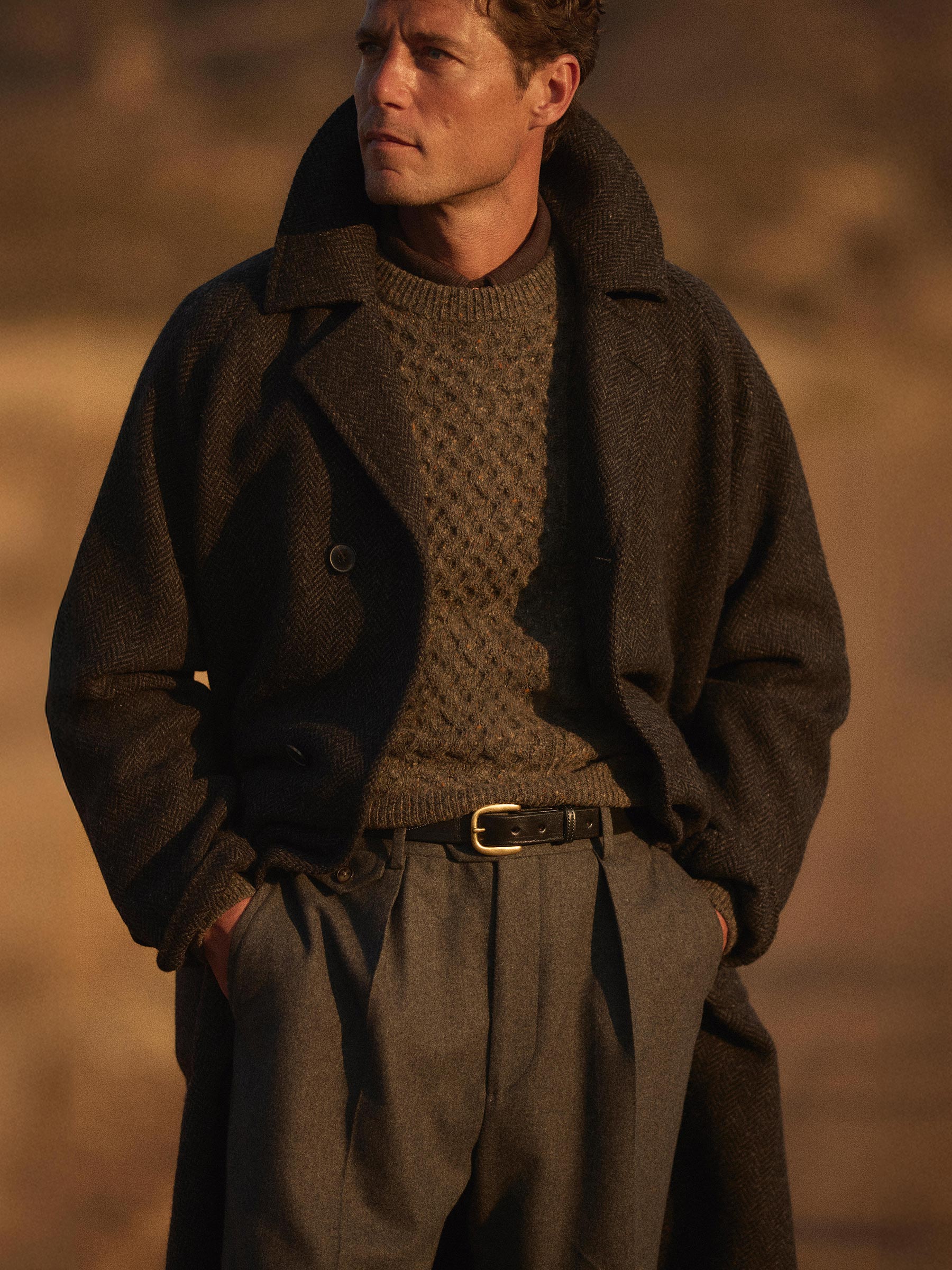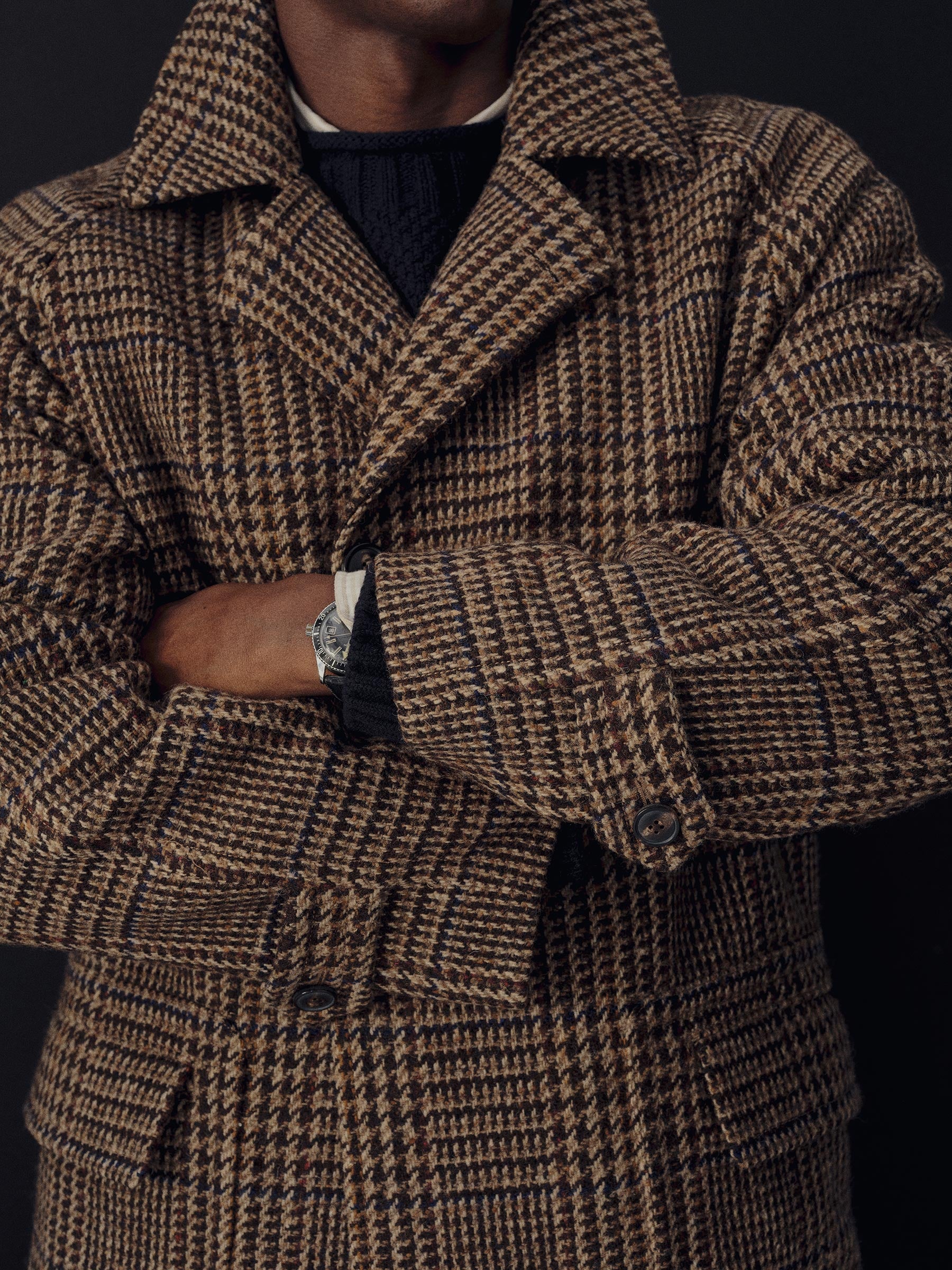 Raglan-sleeved overcoat in handwoven Donegal tweed.