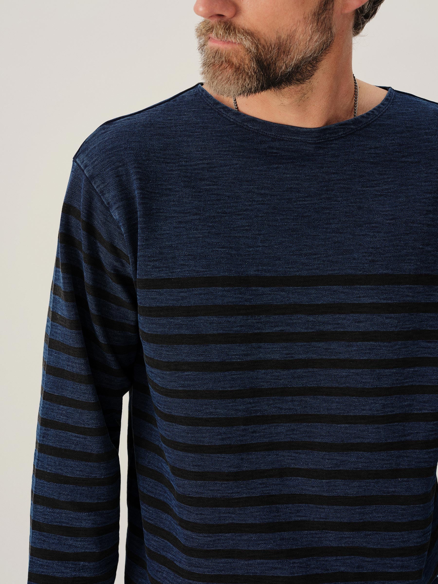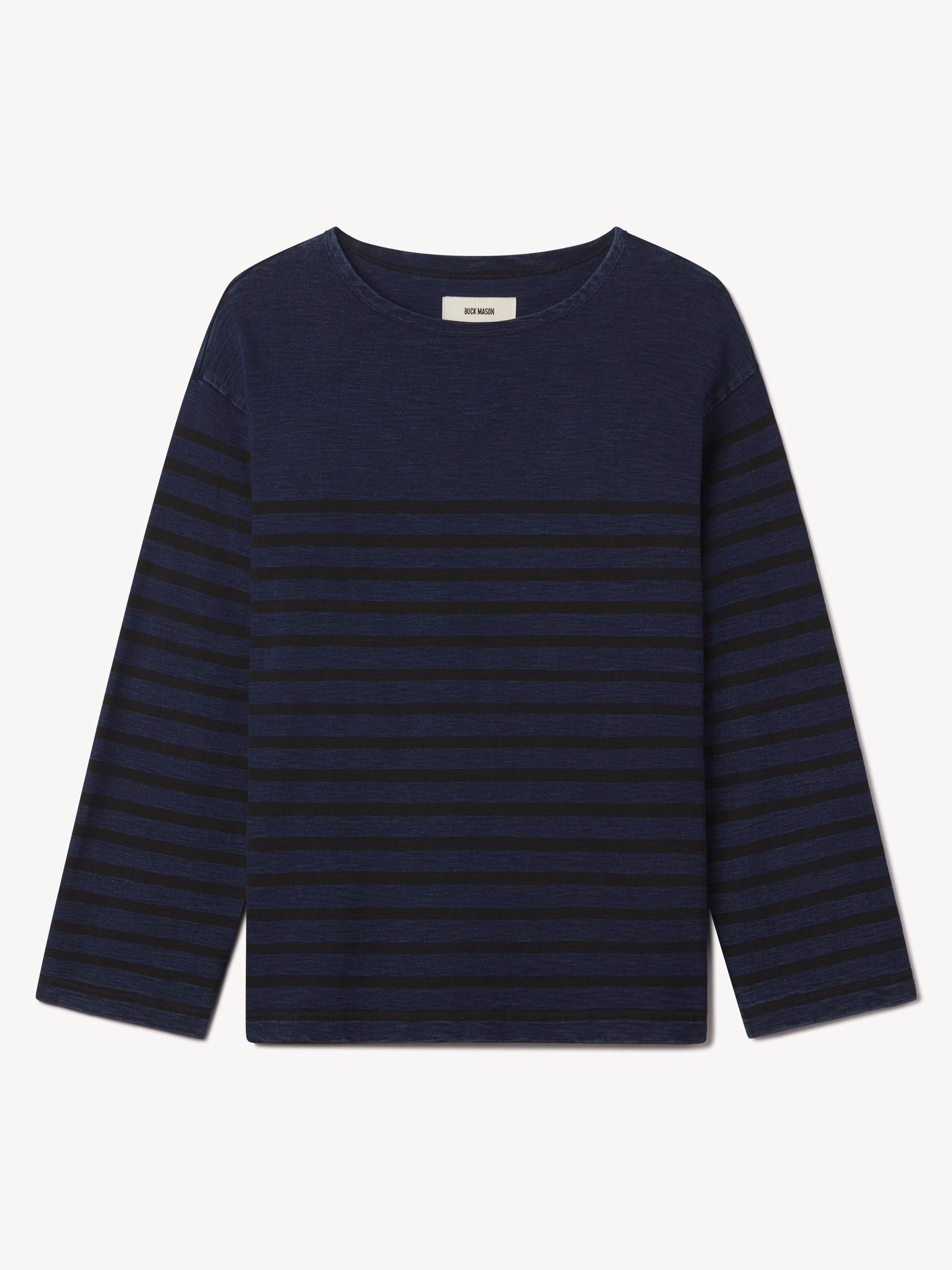 Our nautical-inspired wide neck tee cut from broken-in yet hard-wearing cotton with indigo and black sulfur-dyed stripes.