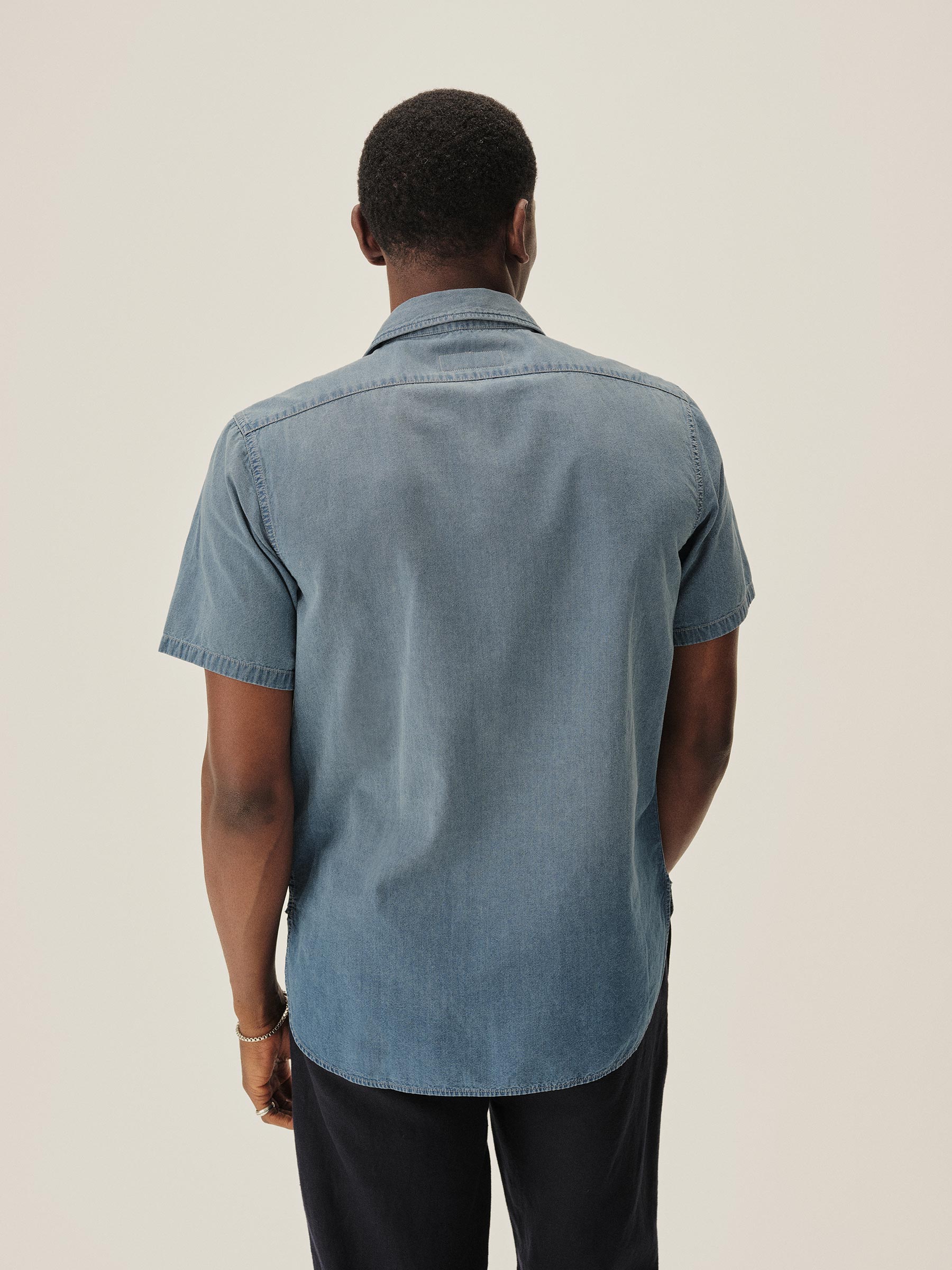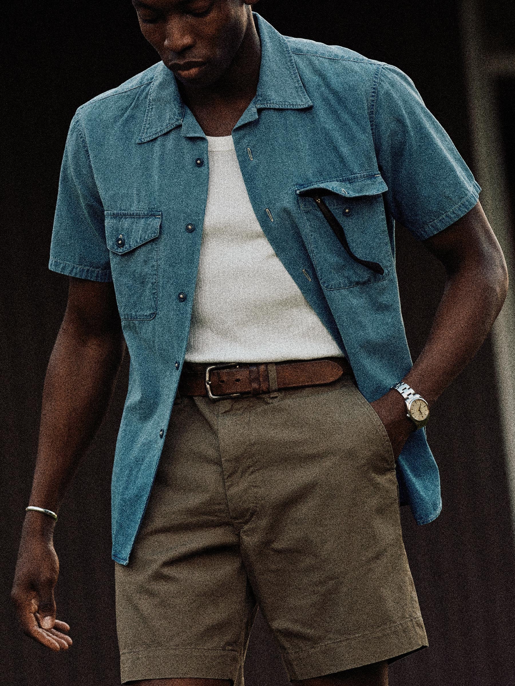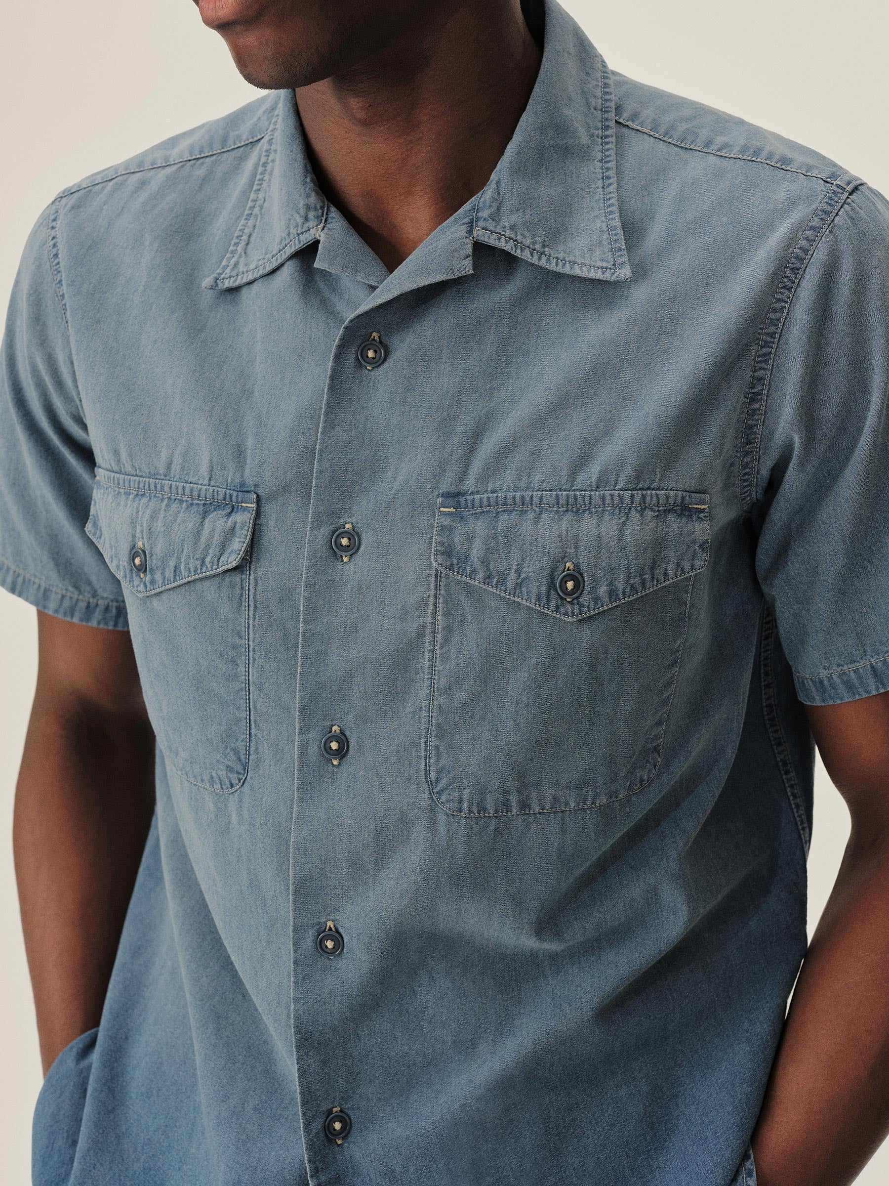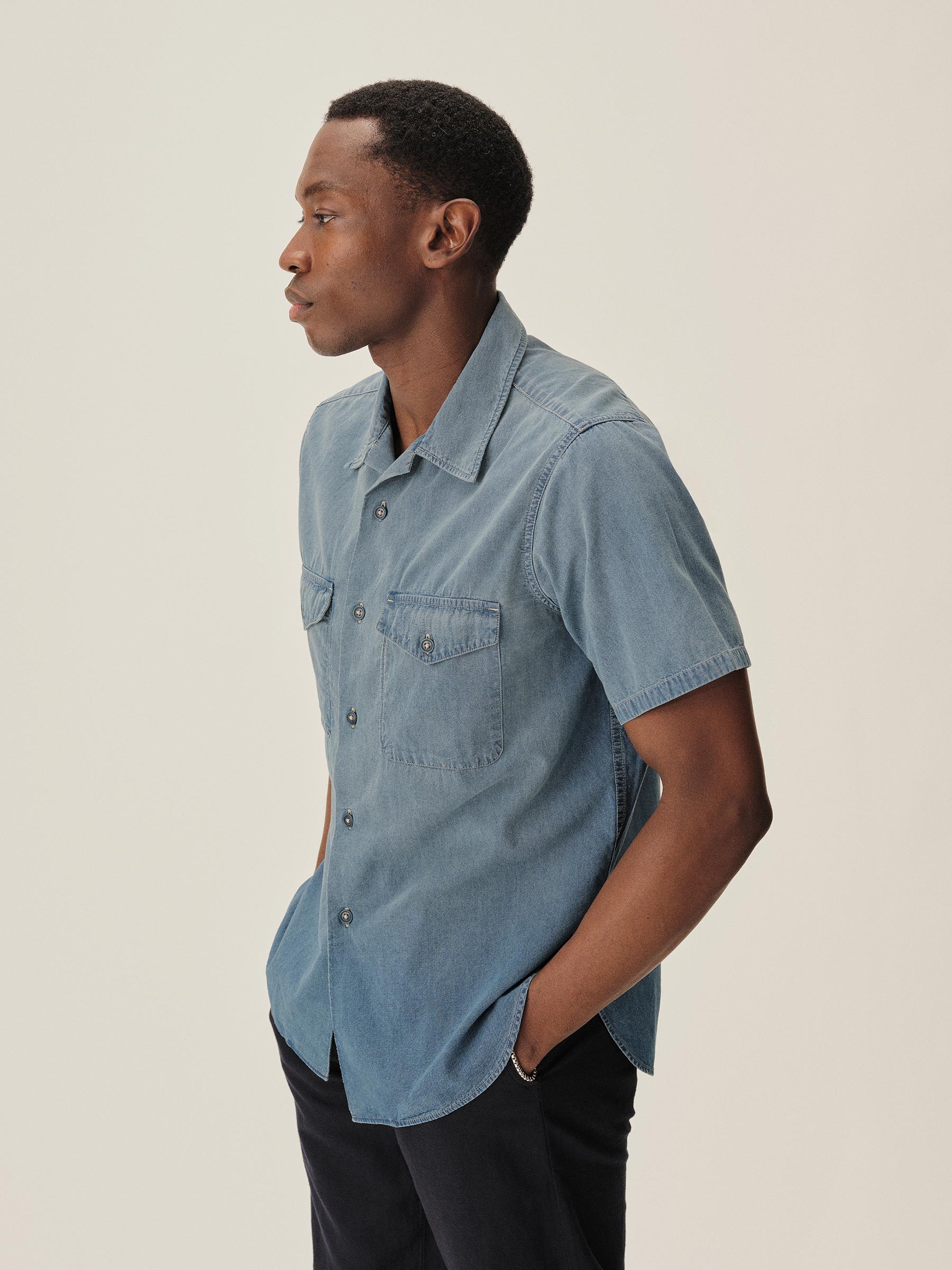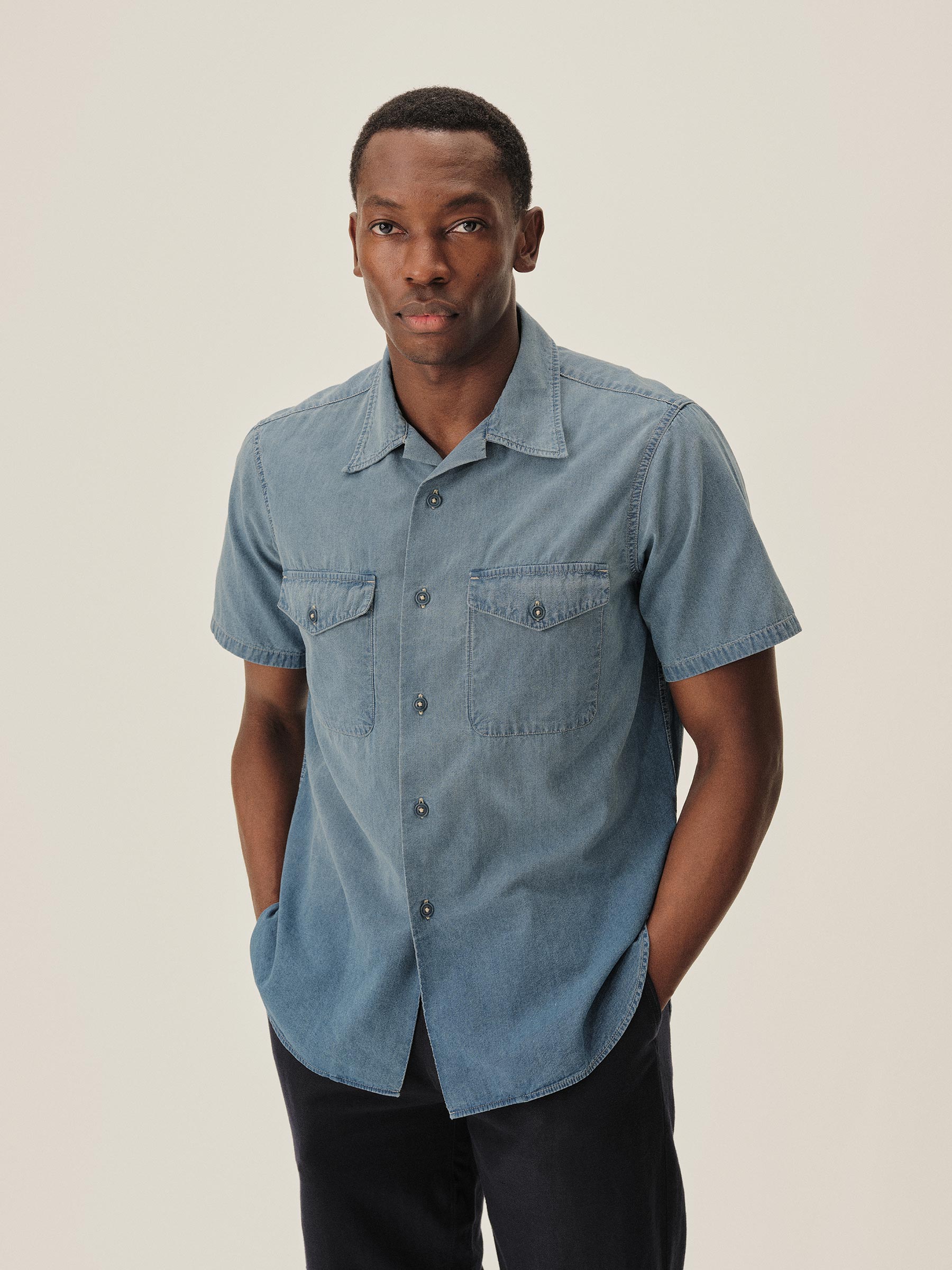 Classic fit, warm weather utility in a short-sleeve cotton poplin shirt inspired by a US Navy tropical design from the 1970s.