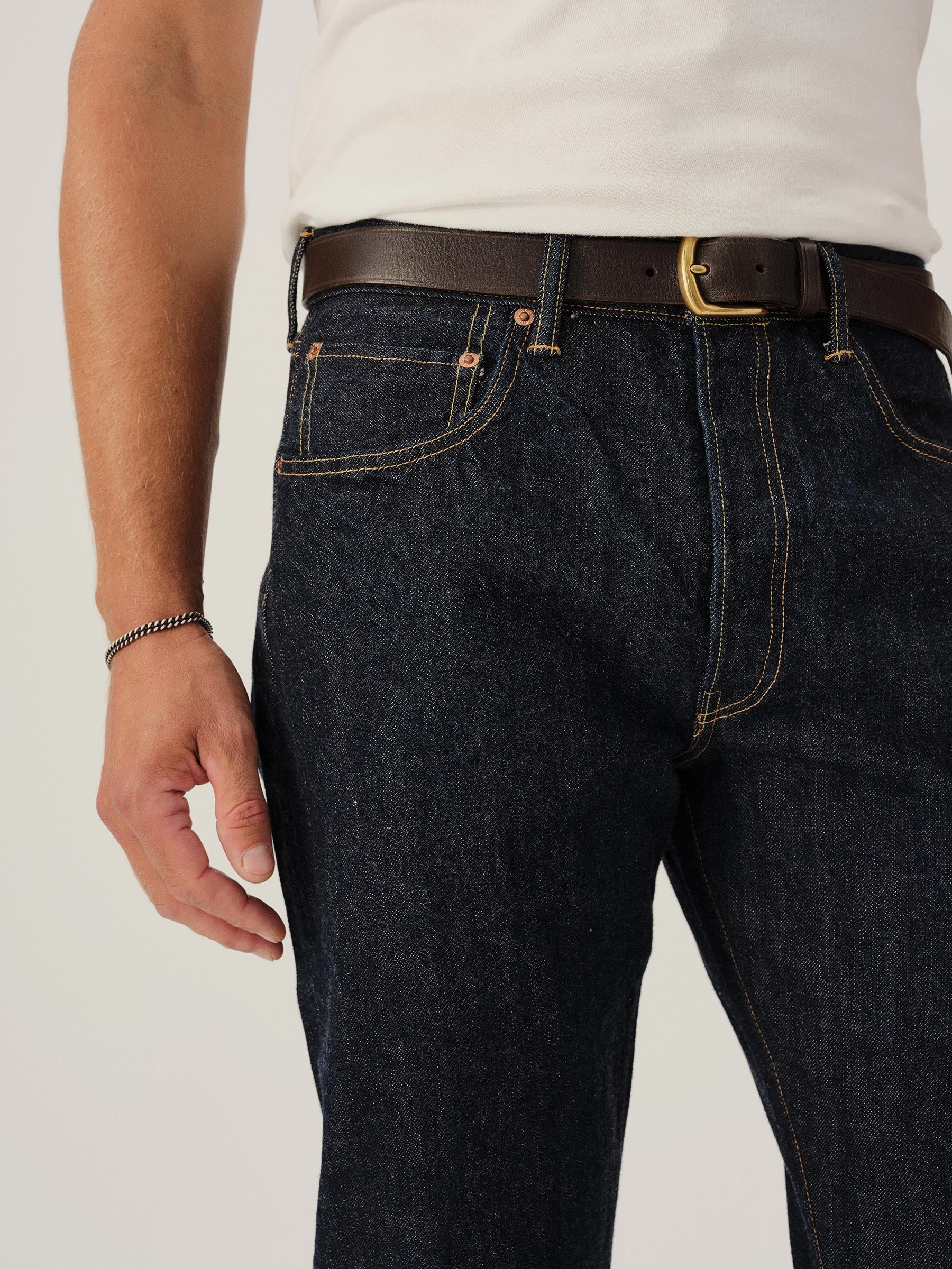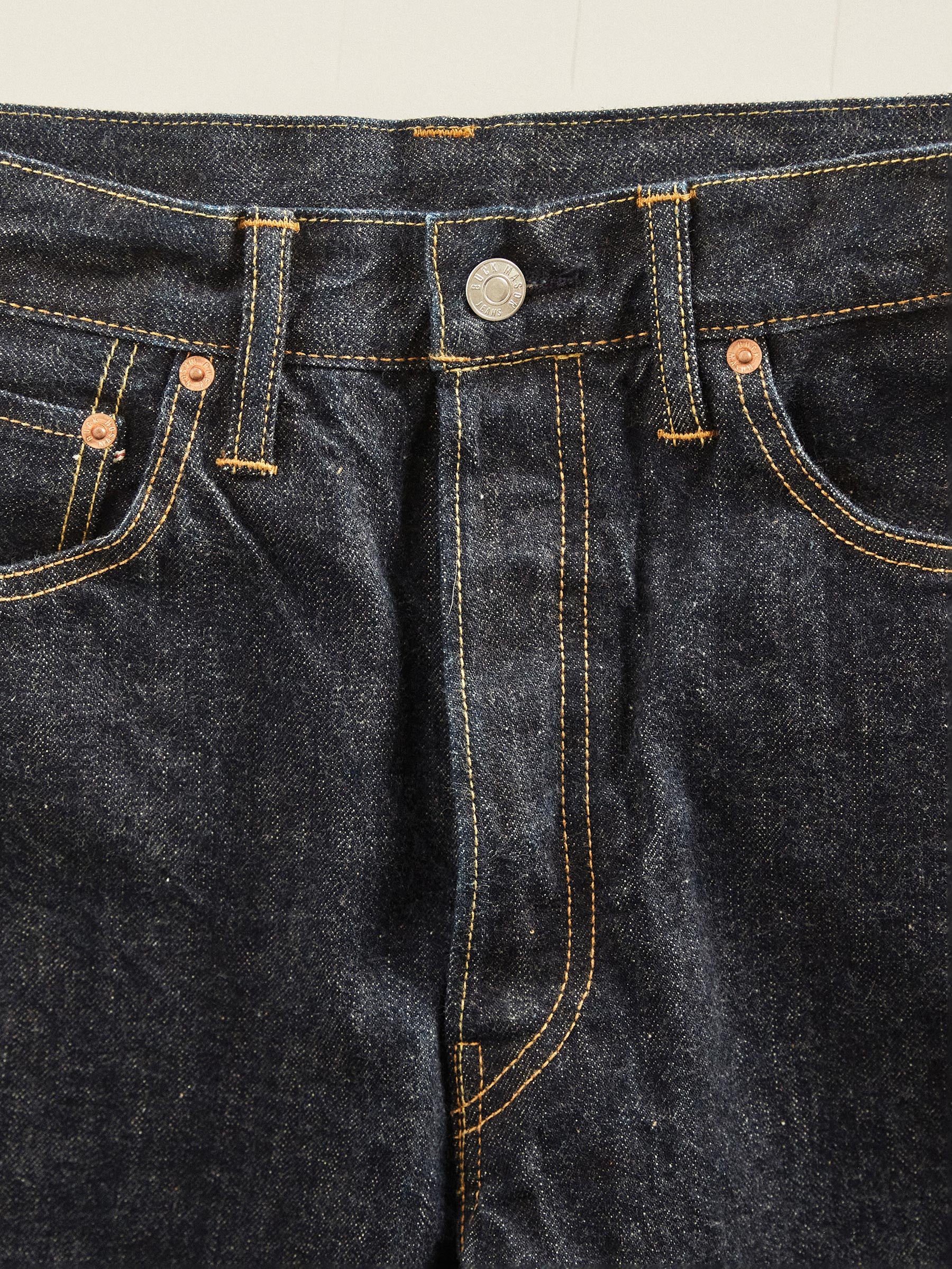 Vintage-inspired, unsanforized selvedge denim in a mid-rise with an easy straight fit that tapers below the knee. Button fly. Washed to control shrinkage.