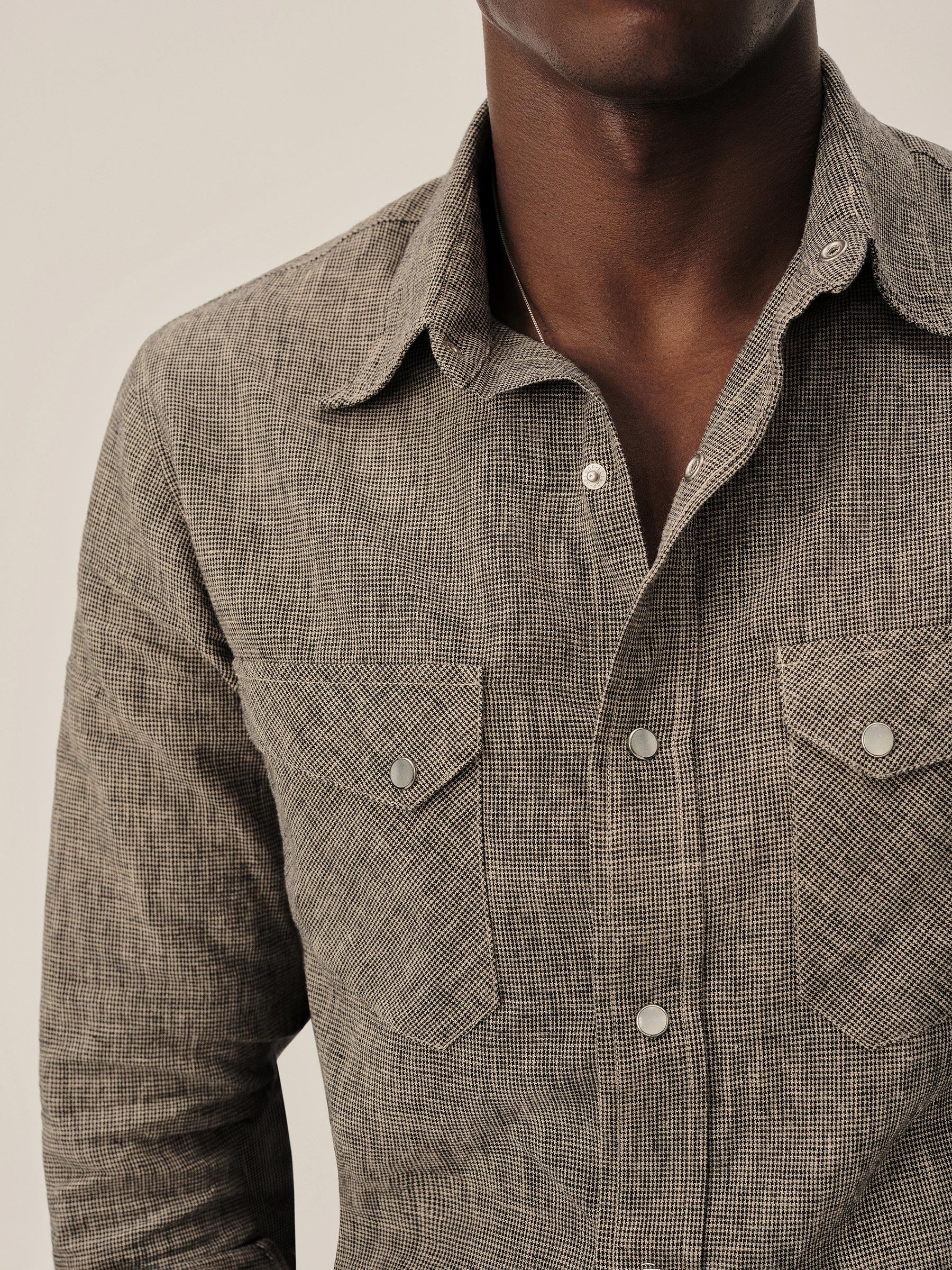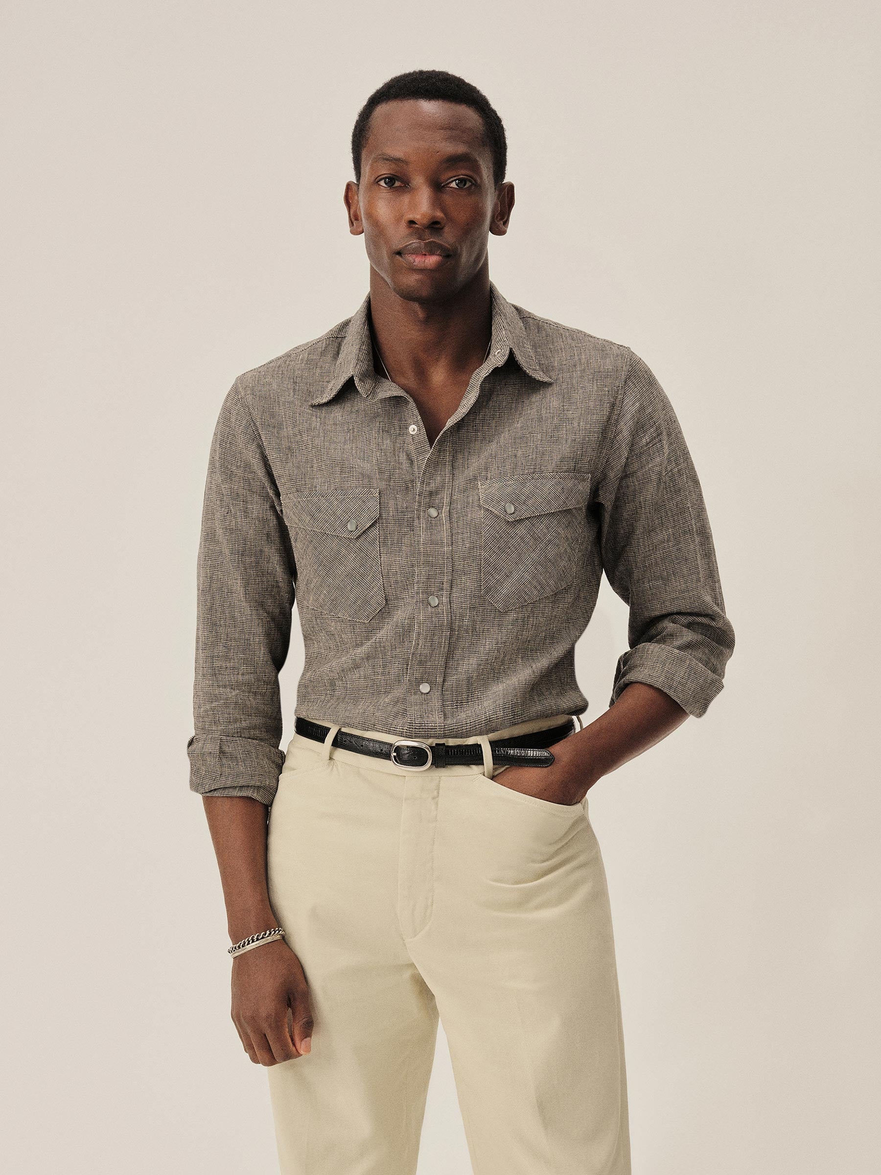 In the style of the 1940s, a classic fit western with slanted pocket flaps, cut from a yarn-dyed blend of breezy linen and cotton.