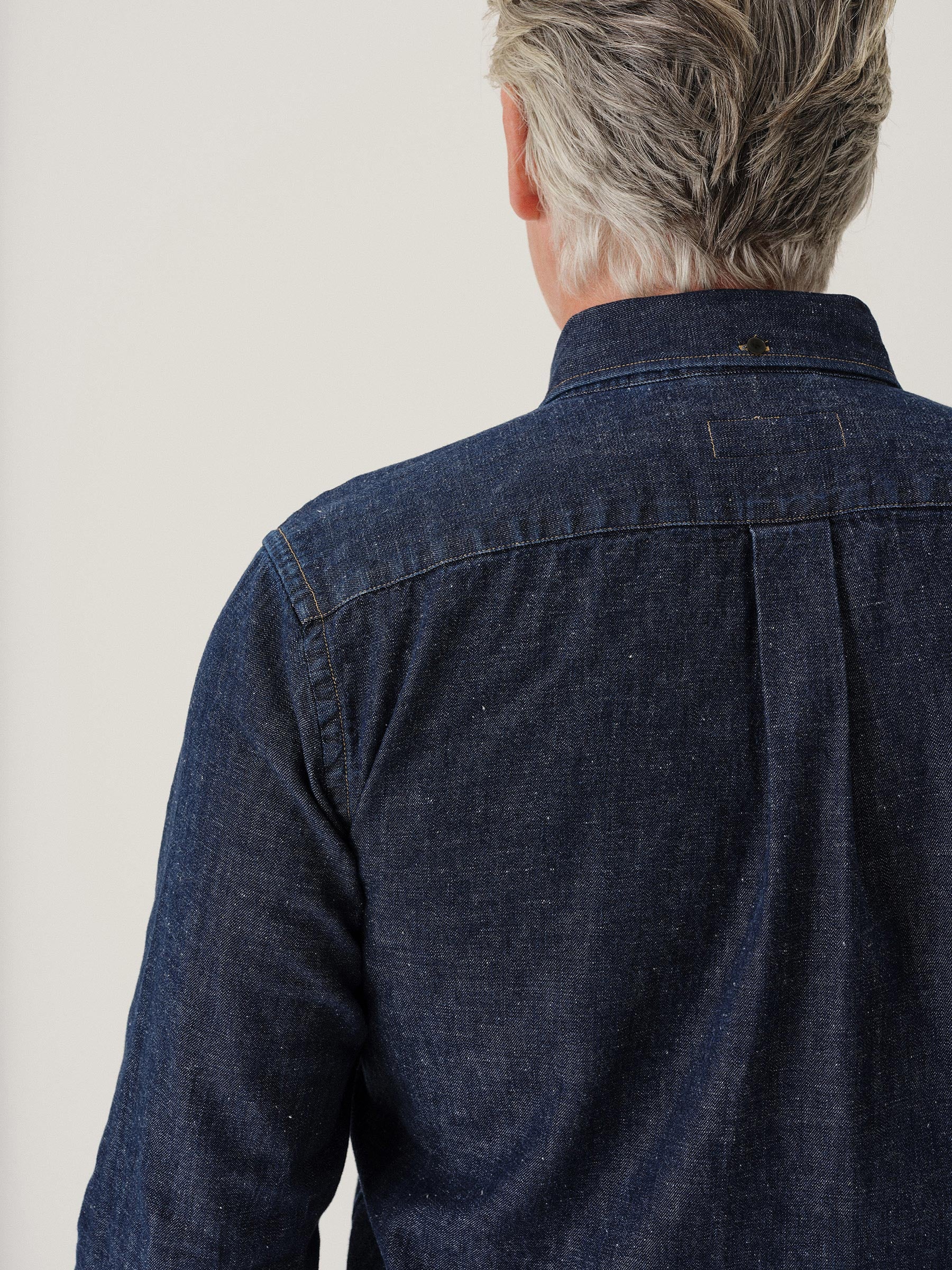 Single pocket button down collar shirt made from a nep-textured indigo denim.