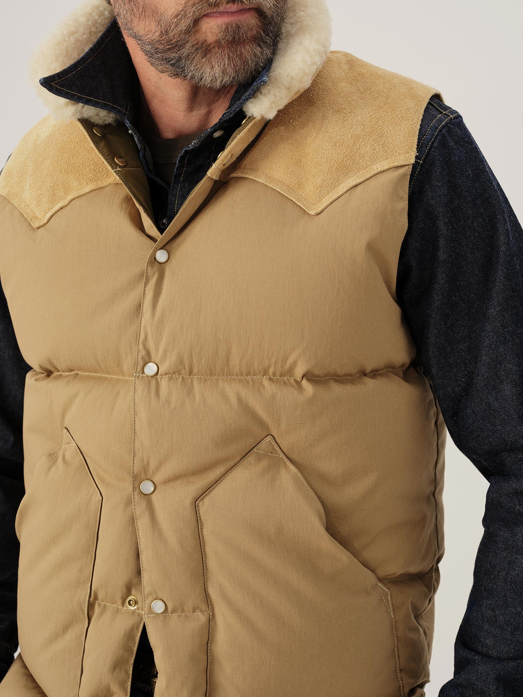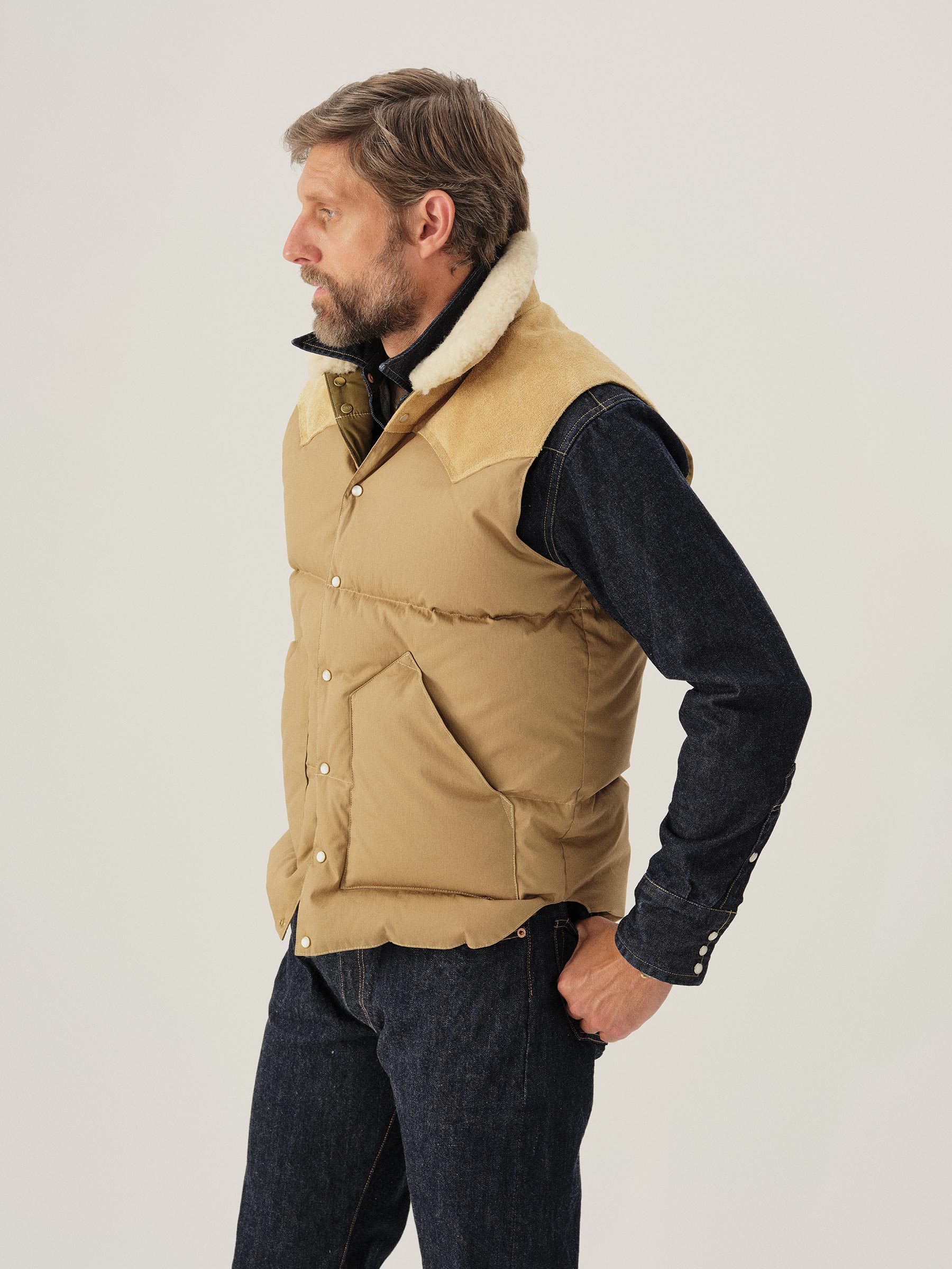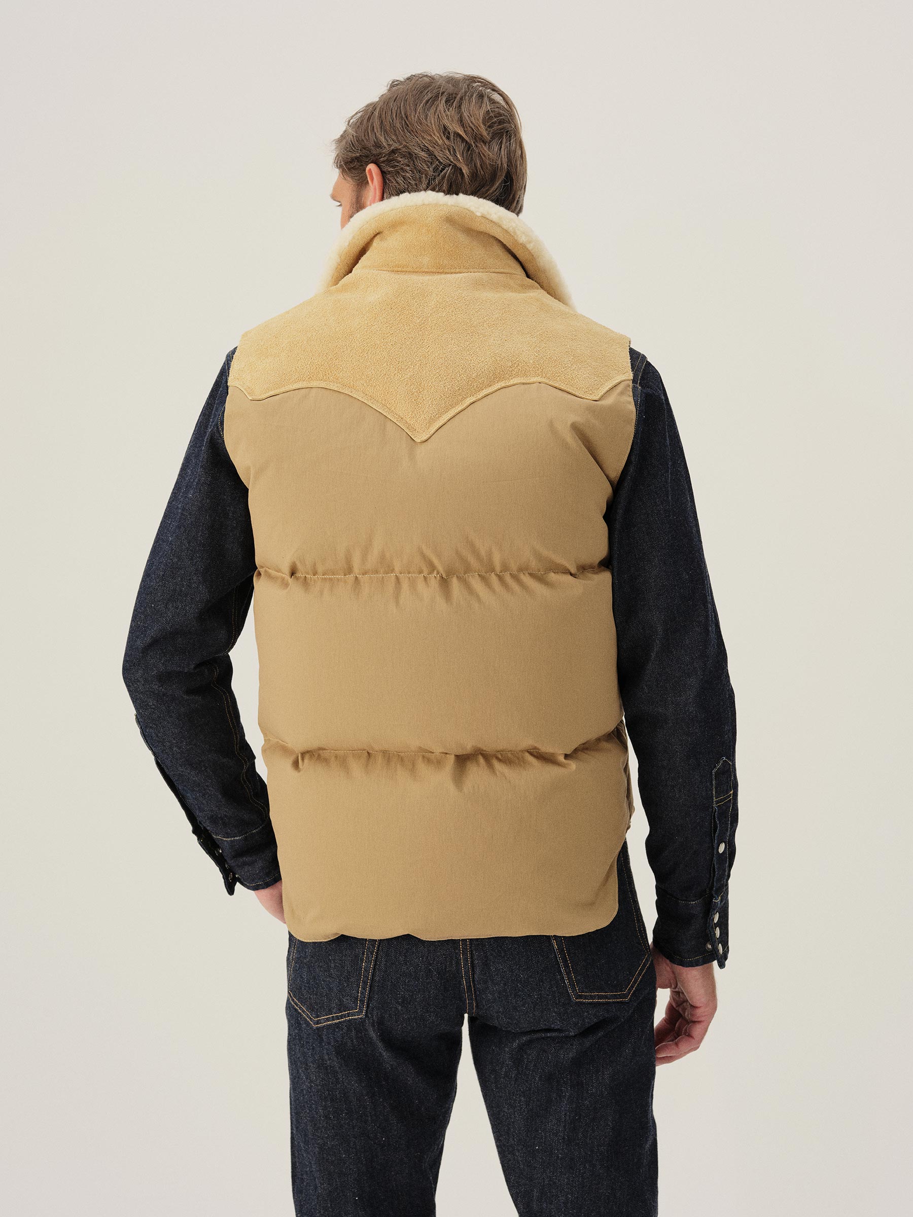 A vintage inspired, Rocky Mountain Featherbed western down fill vest recut in a military repro, 65% cotton, 35% nylon poplin with a matte finish and an authentic shearling collar.