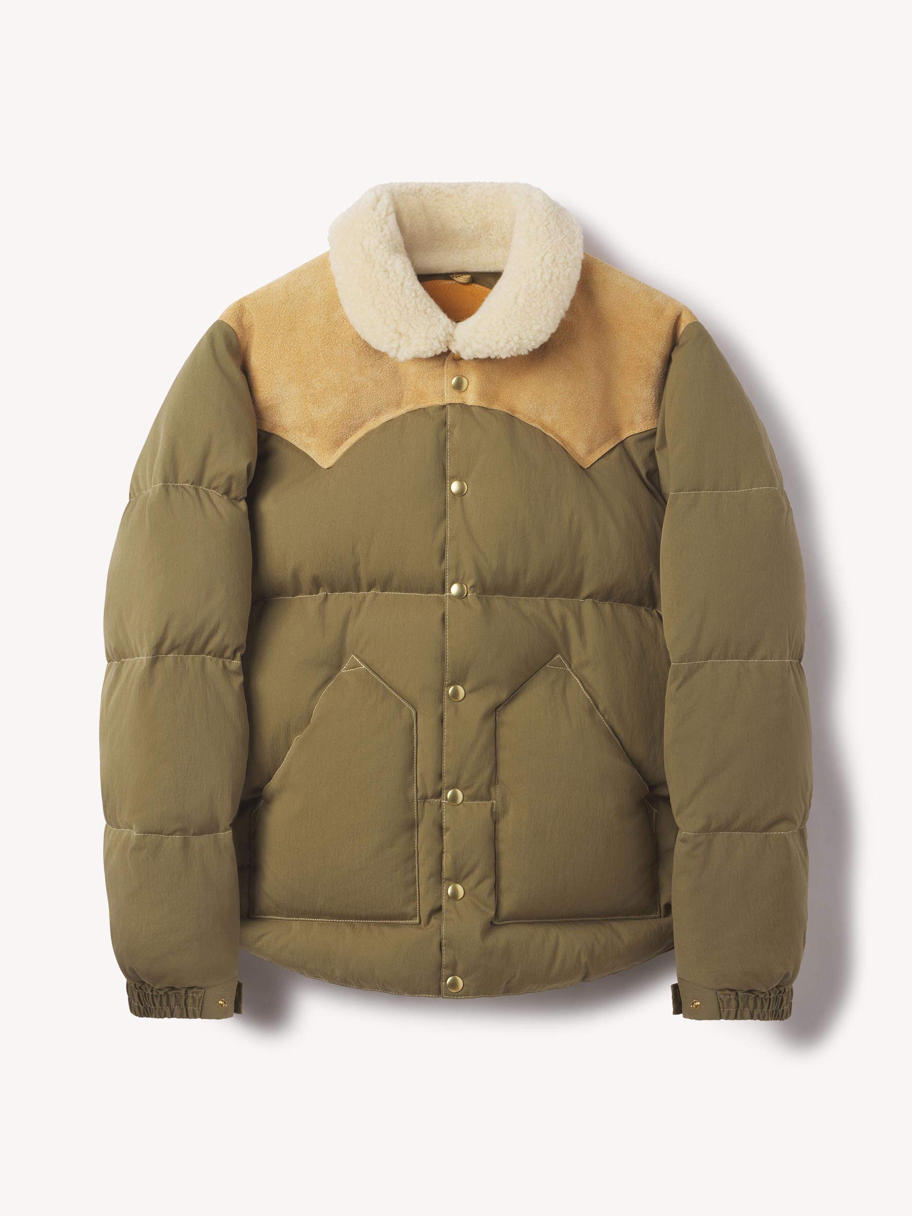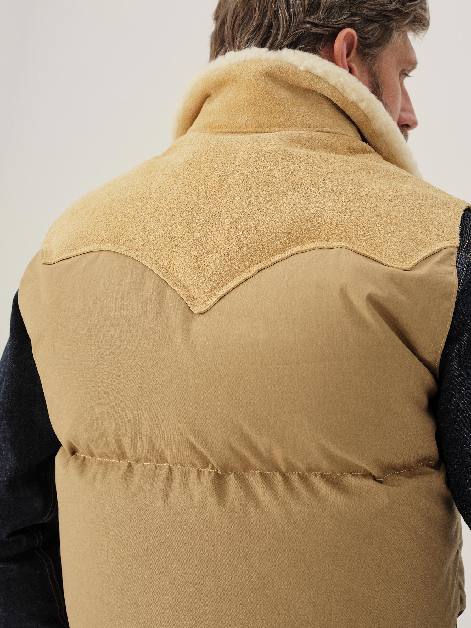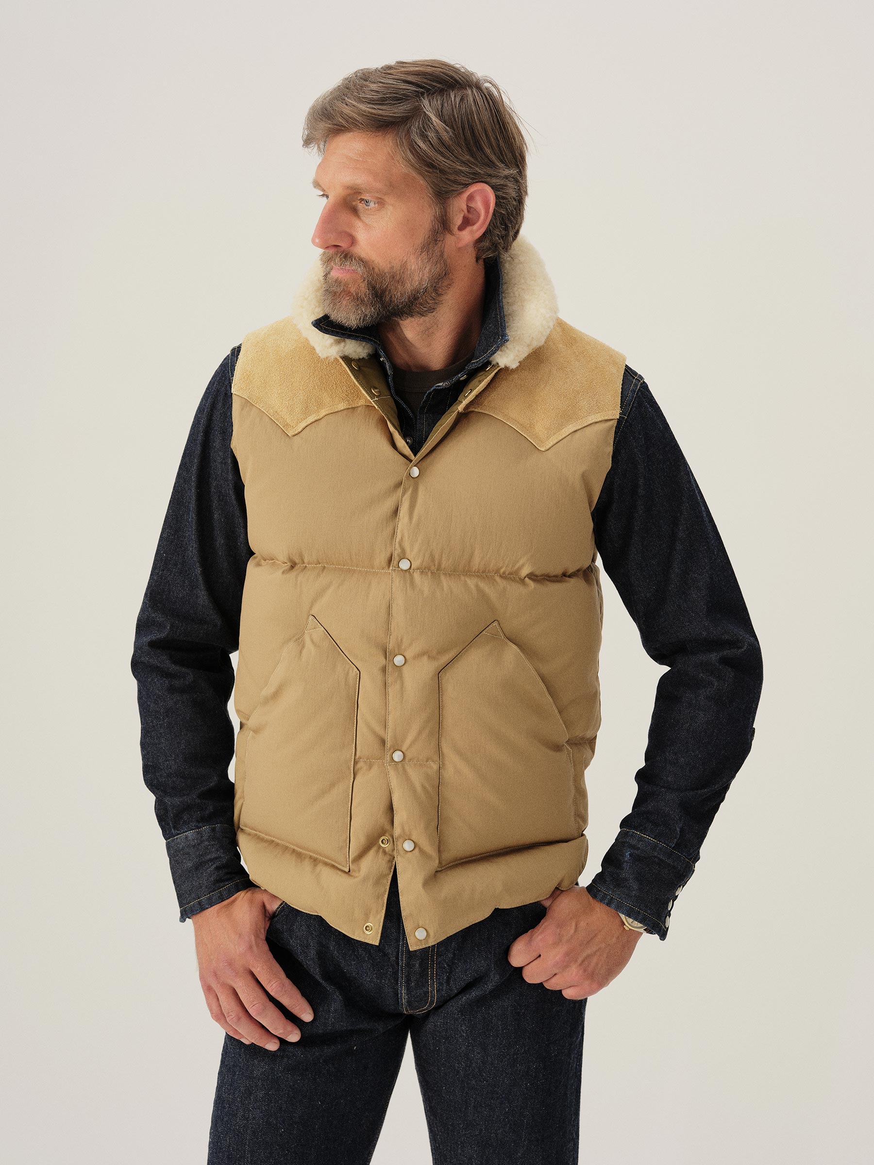 A vintage inspired, Rocky Mountain Featherbed western down fill vest recut in a military repro, 65% cotton, 35% nylon poplin with a matte finish and an authentic shearling collar.