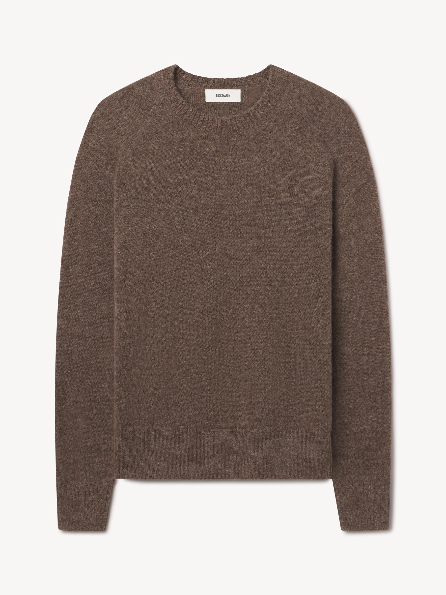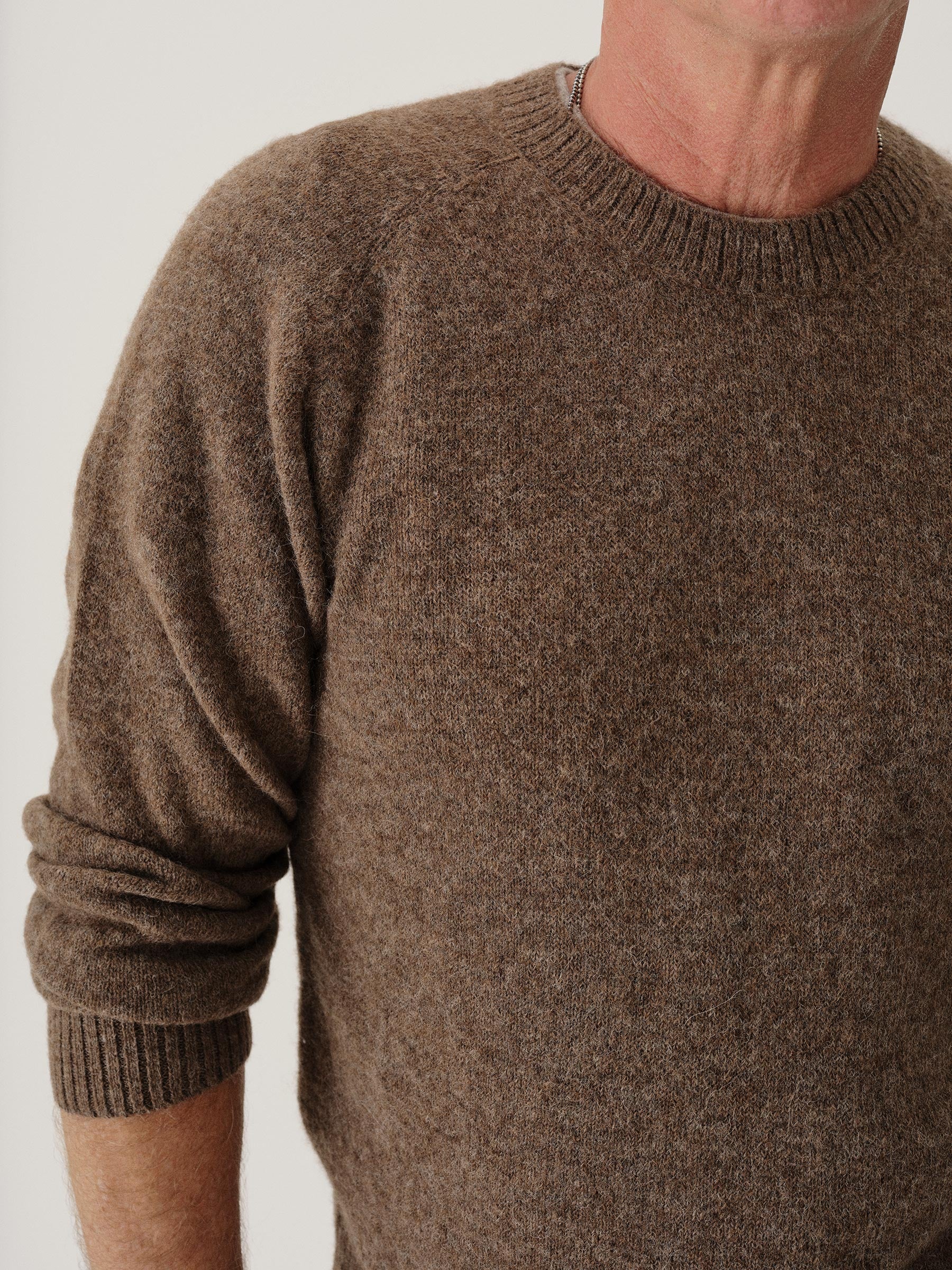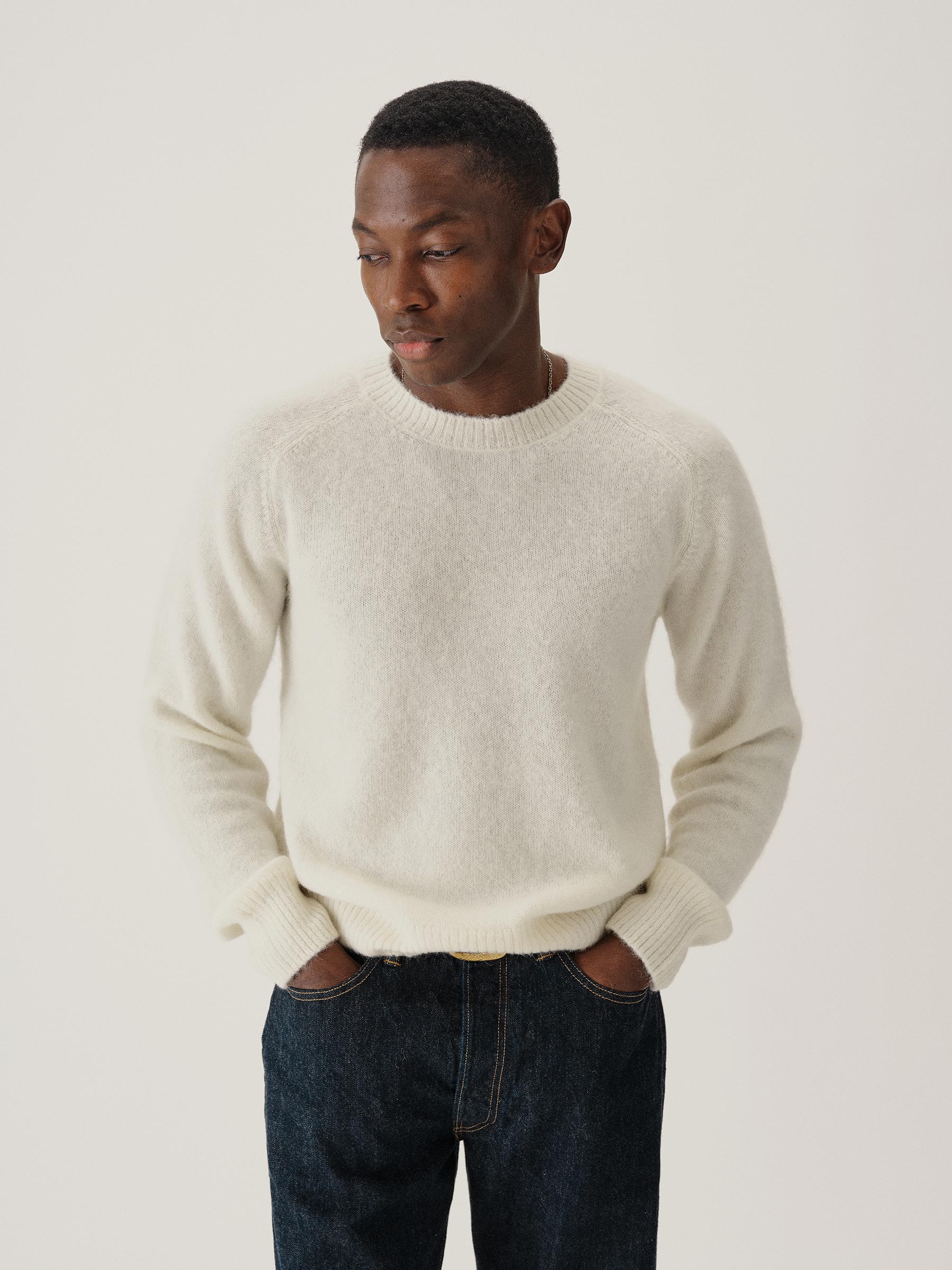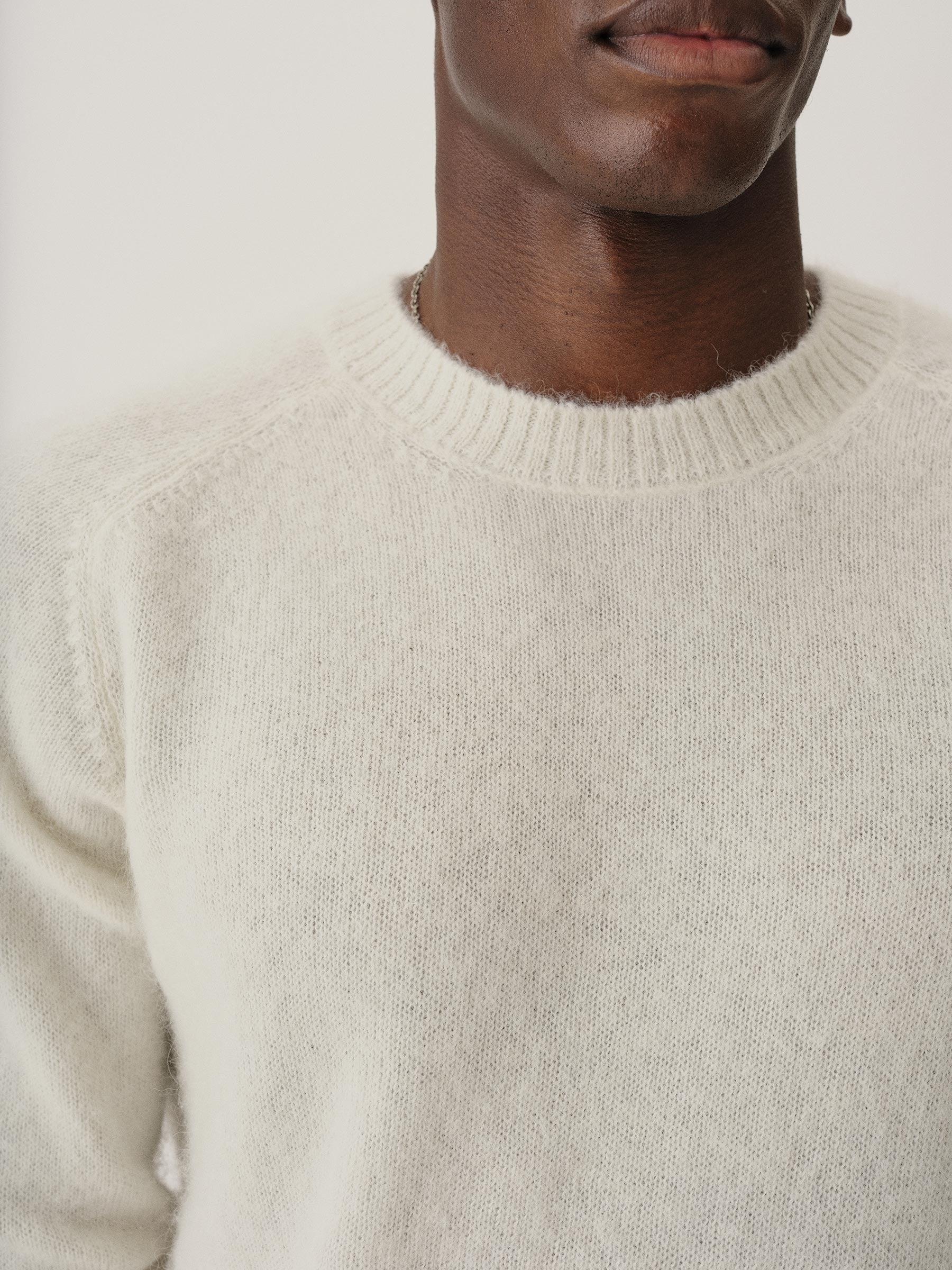 A saddle crew sweater knit from an alpaca blend for a plush, textured hand.