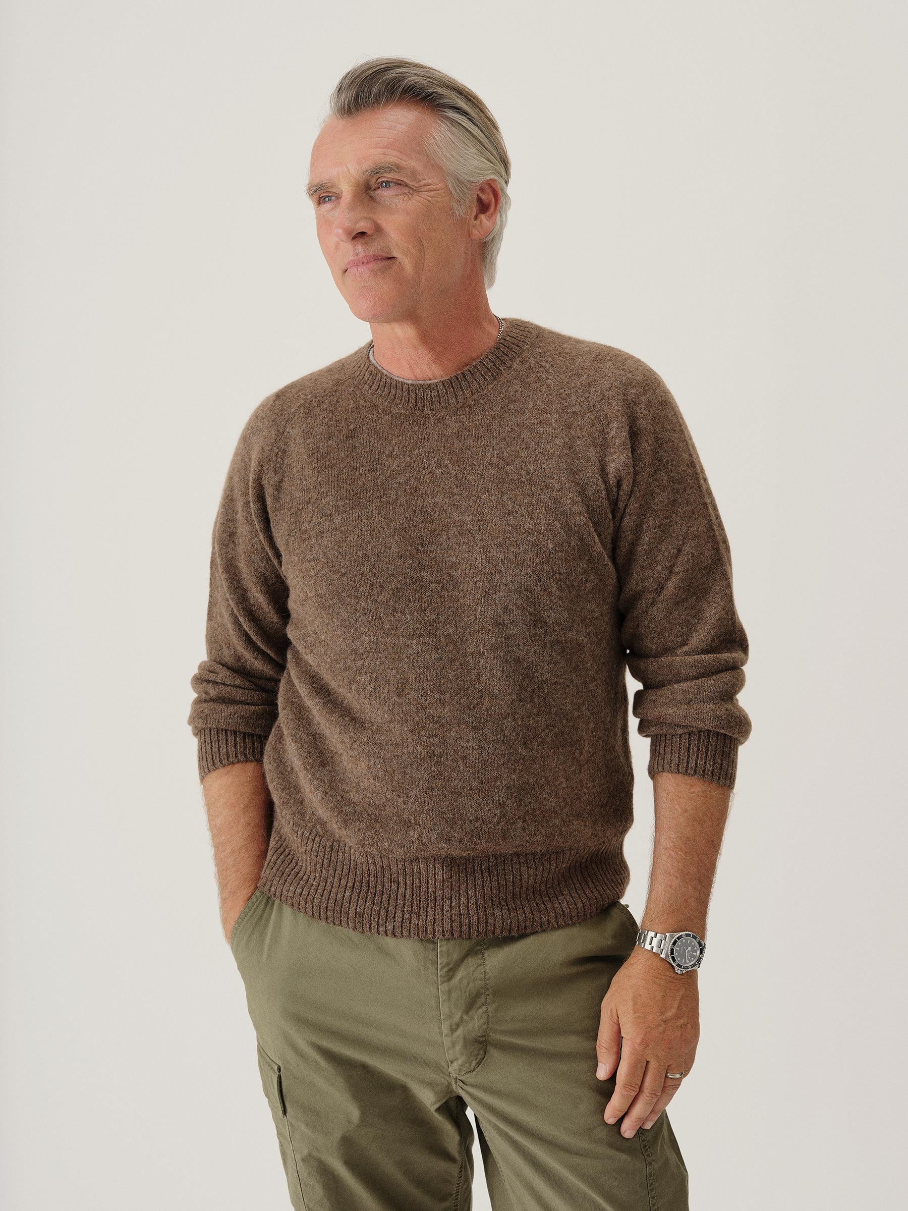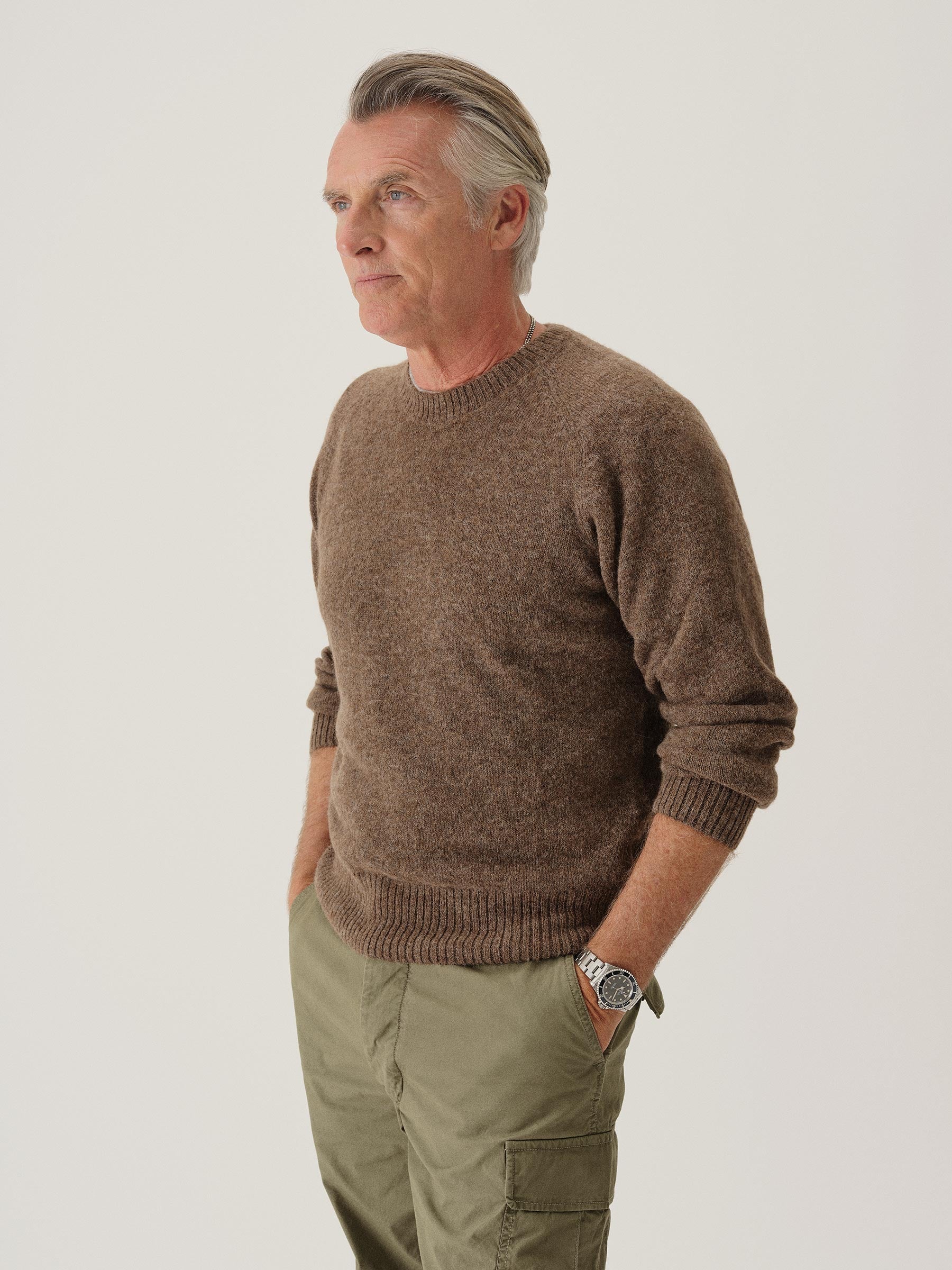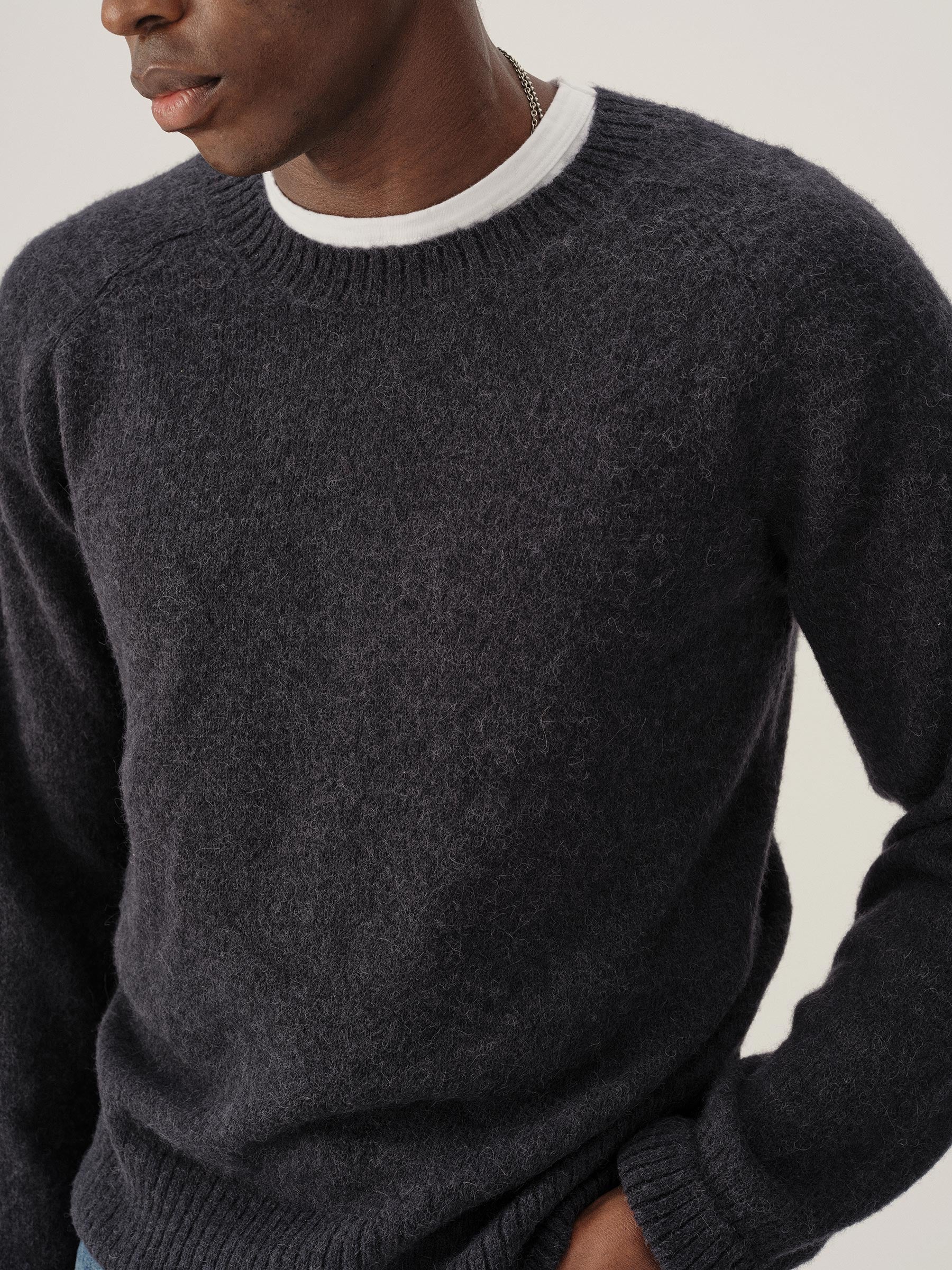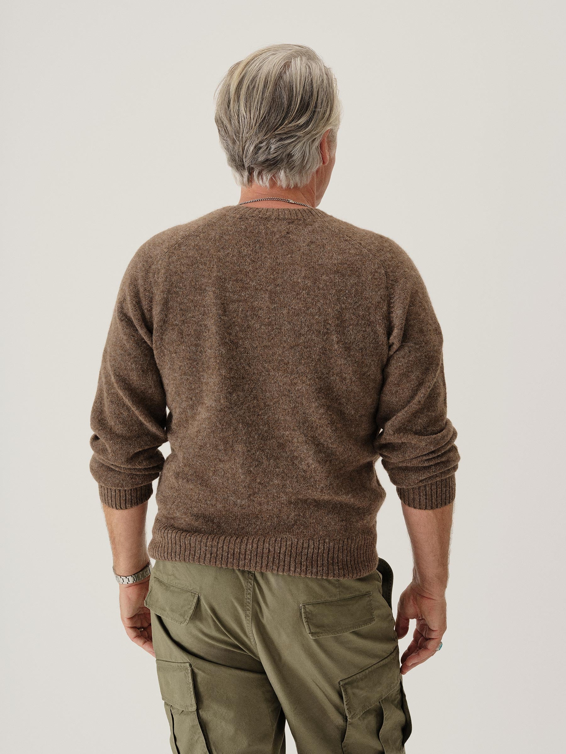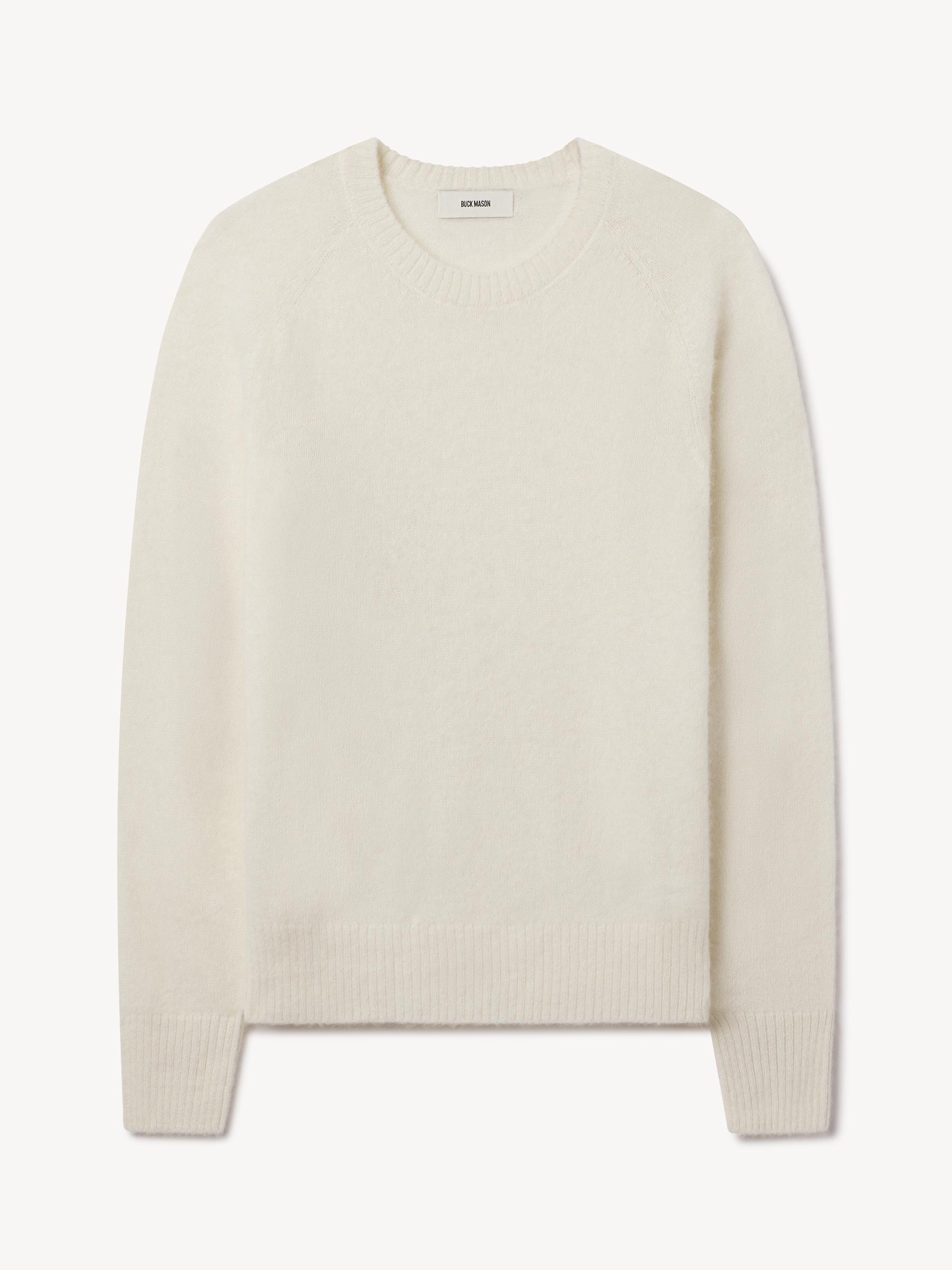 A saddle crew sweater knit from an alpaca blend for a plush, textured hand.