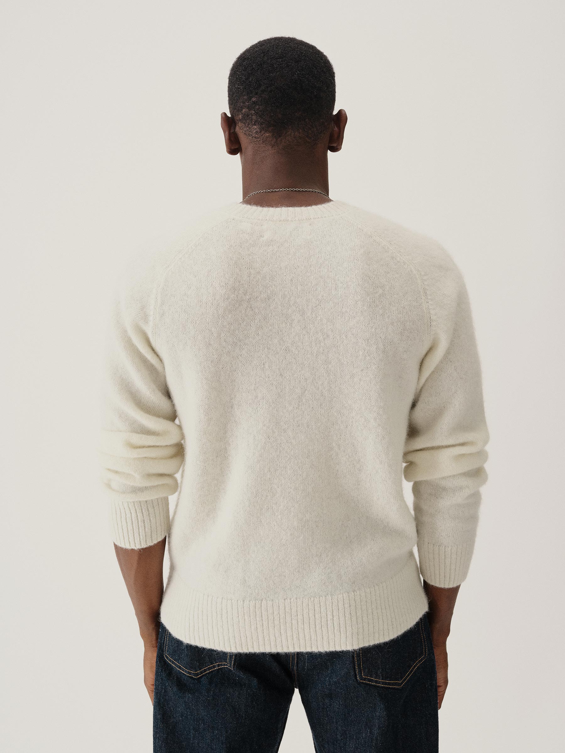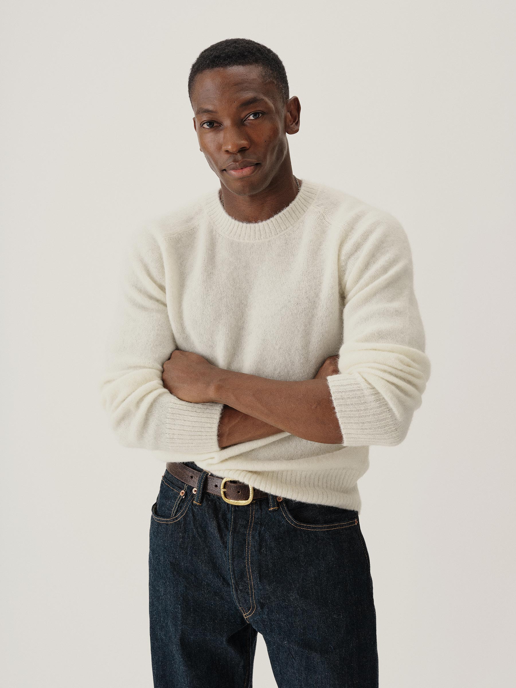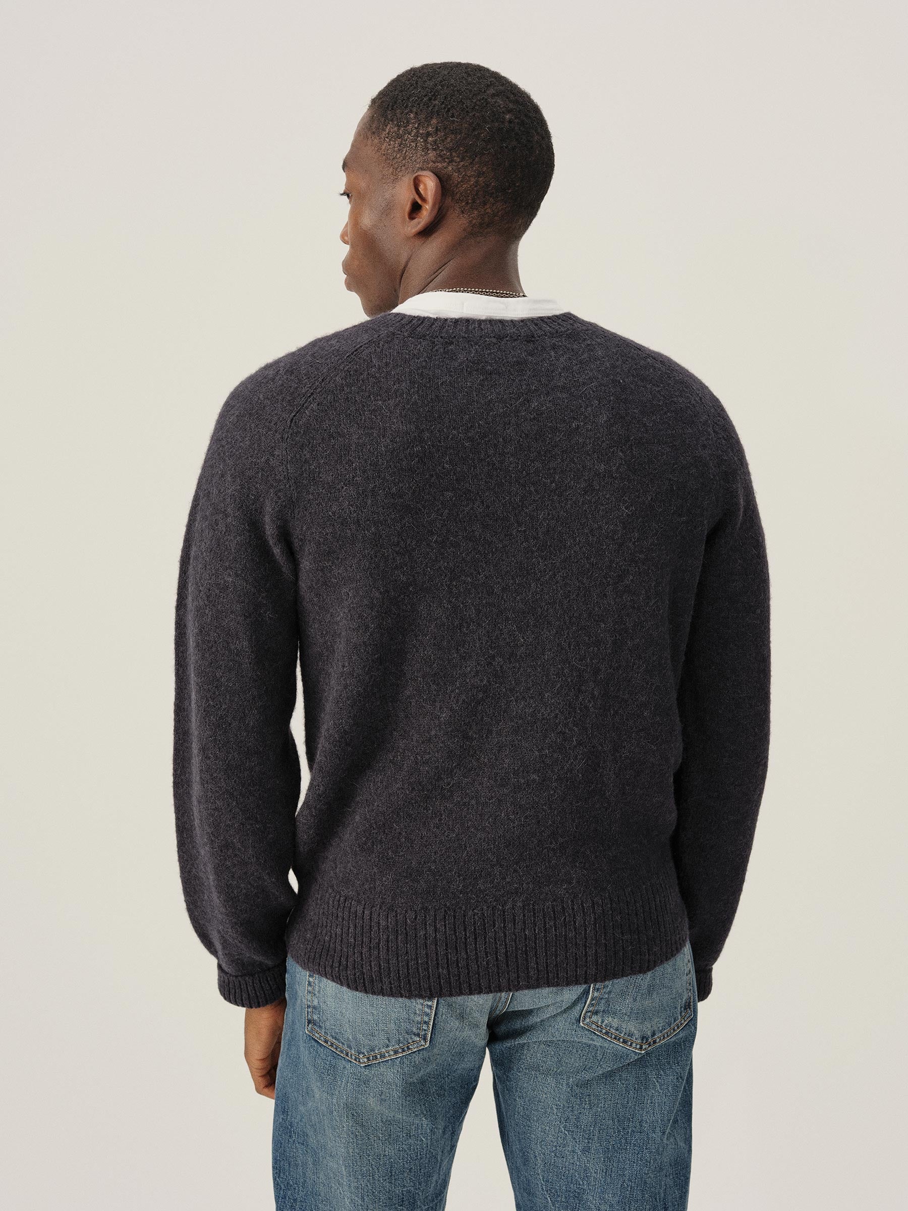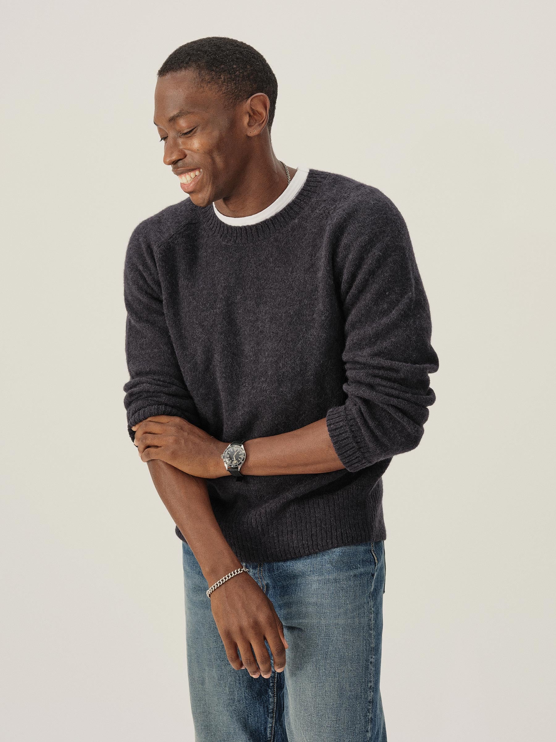 A saddle crew sweater knit from an alpaca blend for a plush, textured hand.