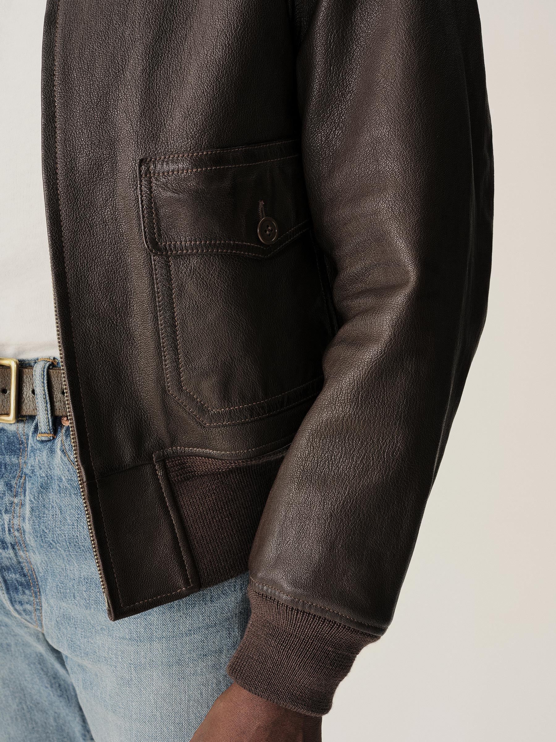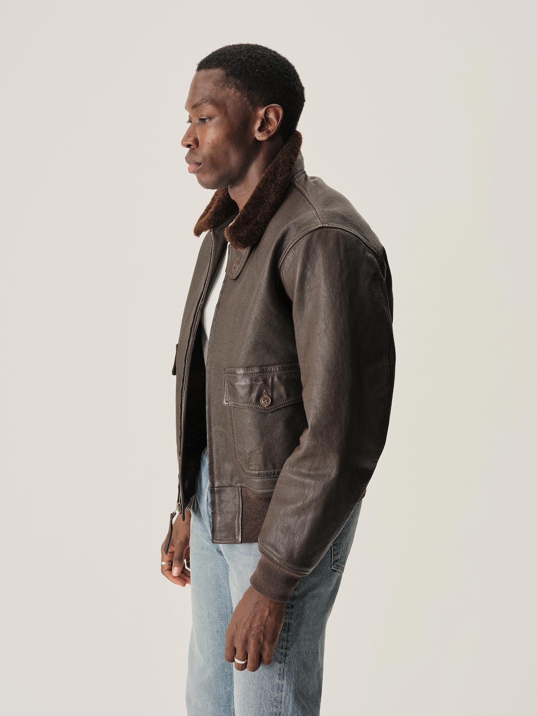 A faithful interpretation of the navy’s G-1 flight jacket. Crafted from vegetable-tanned goatskin with a bold shearling collar.