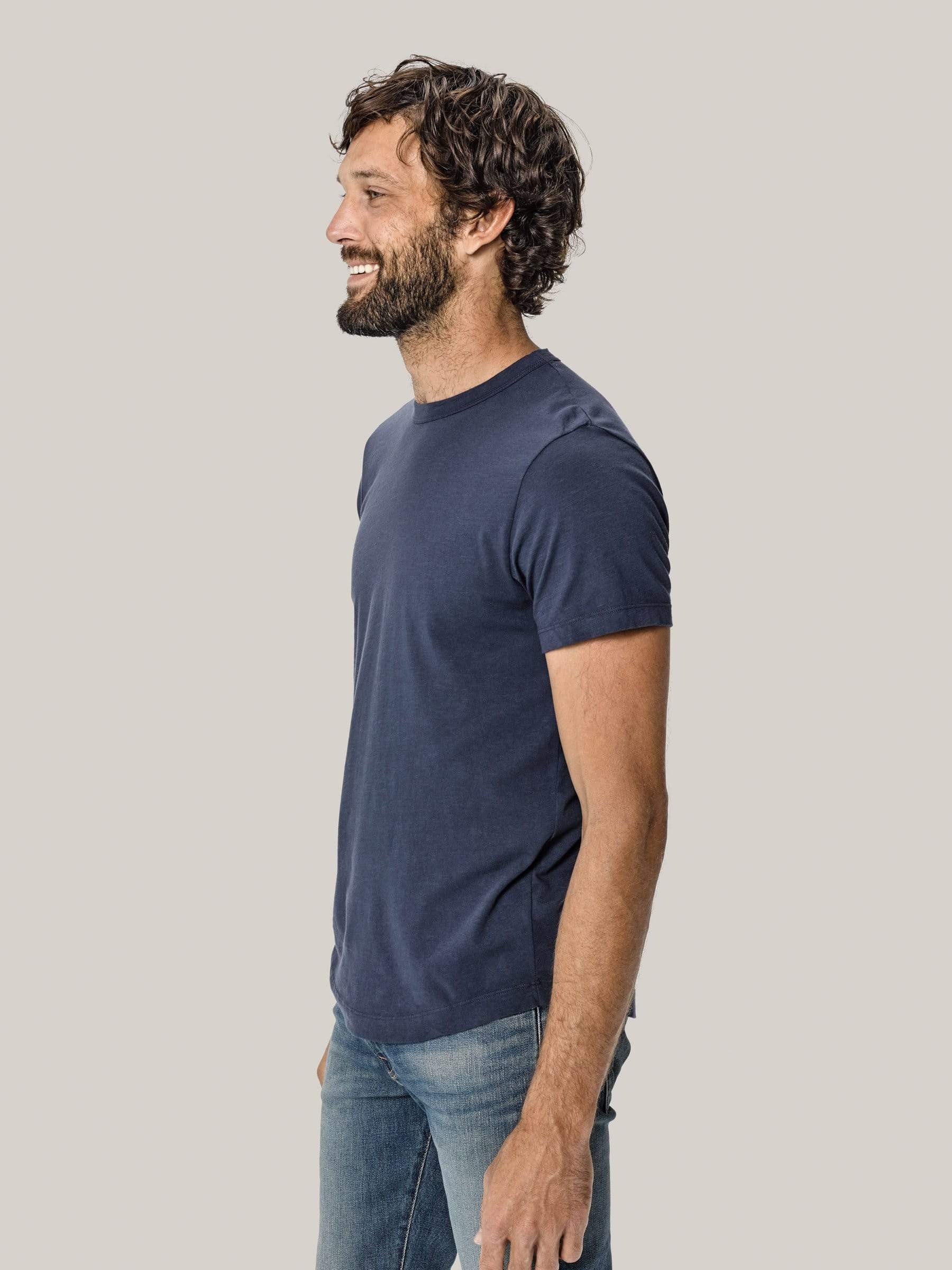 Our signature curved hem tee in USA-grown cotton with a light slub texture and 1.5″ shorter length. Made at BM Knitting Mills in Mohnton, PA.