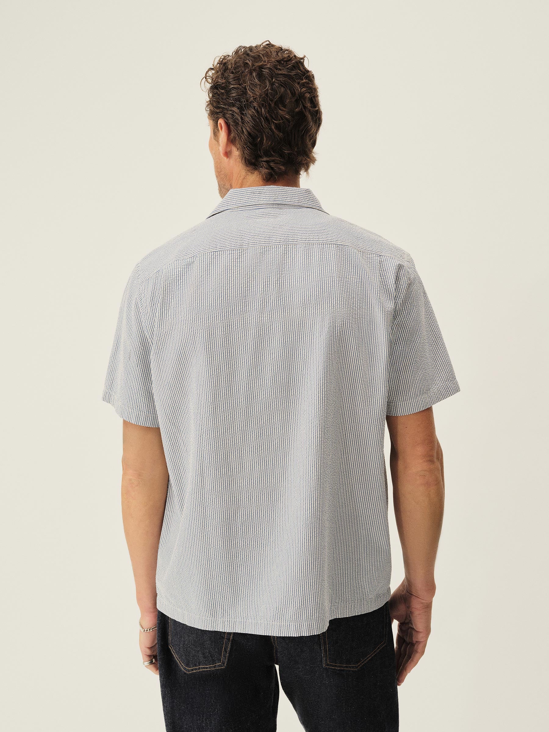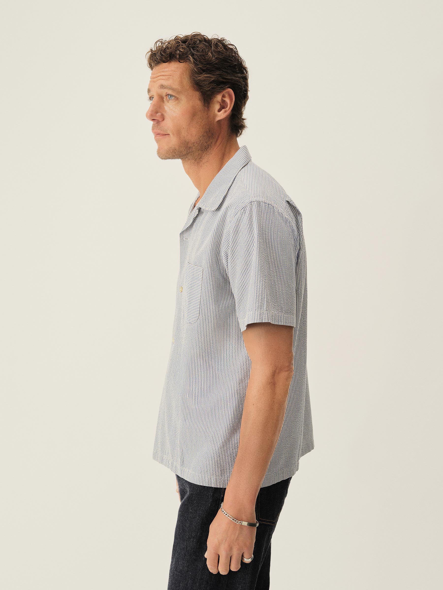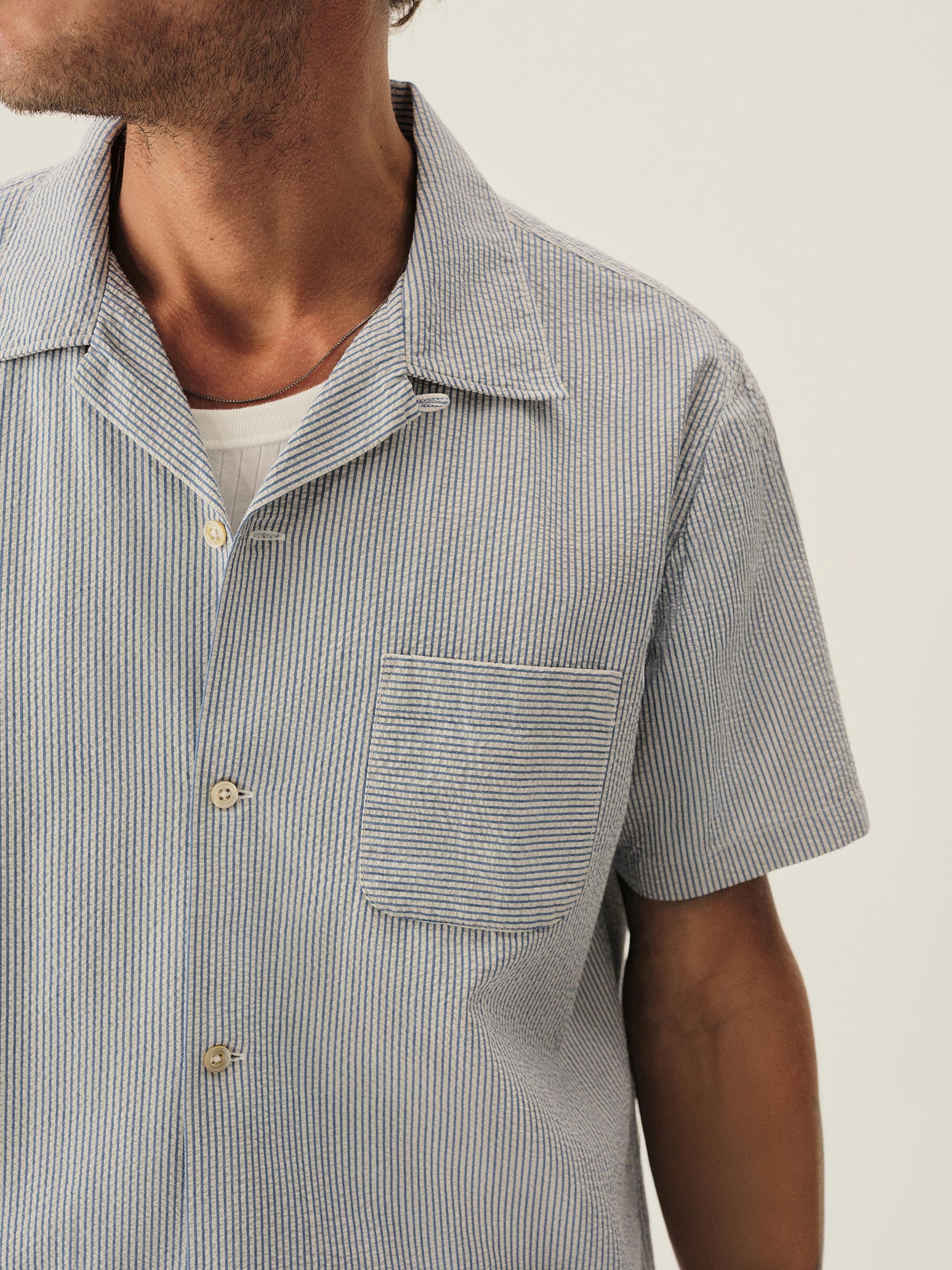A relaxed, airy one pocket seersucker camp shirt cut in a boxy fit.