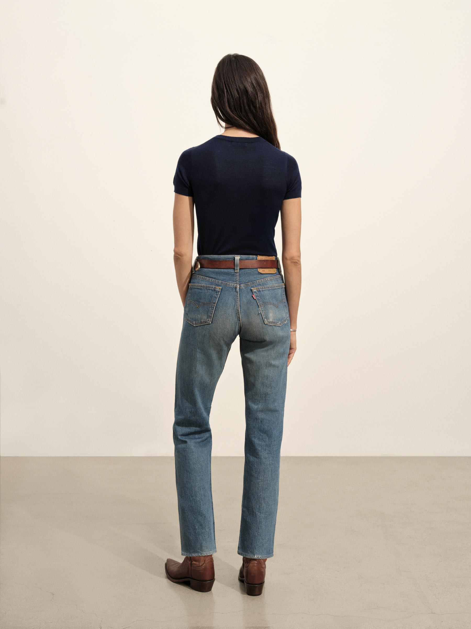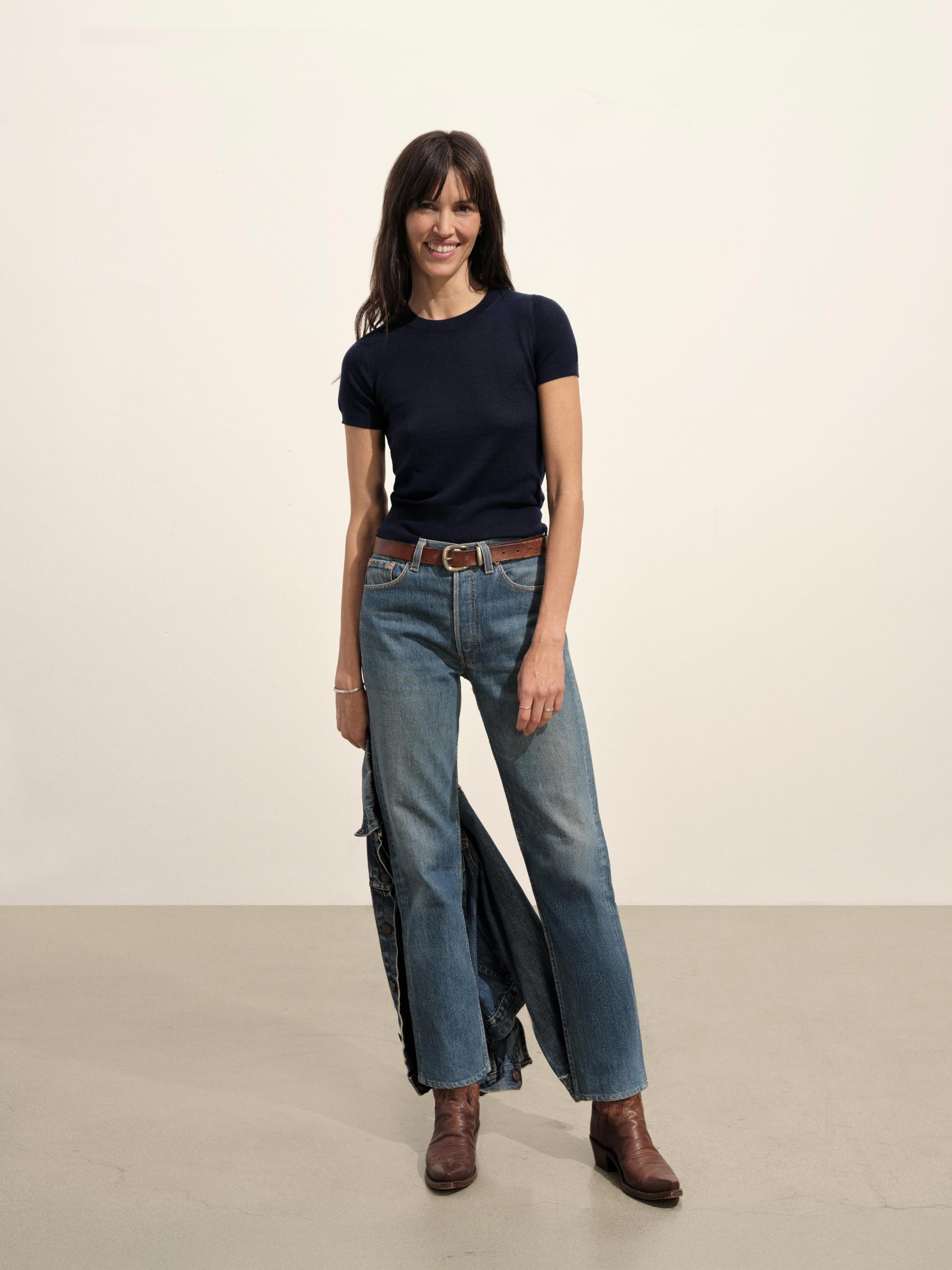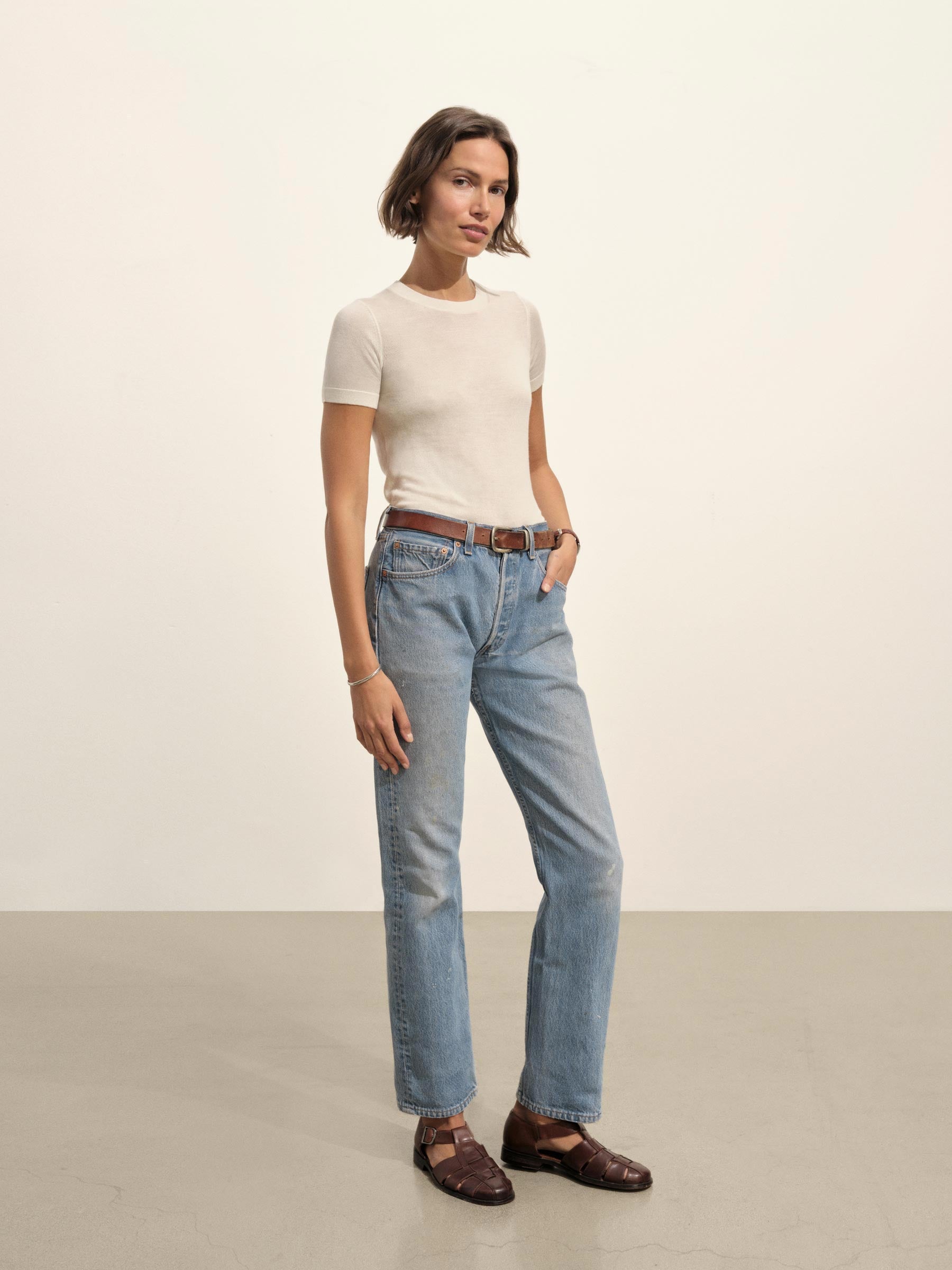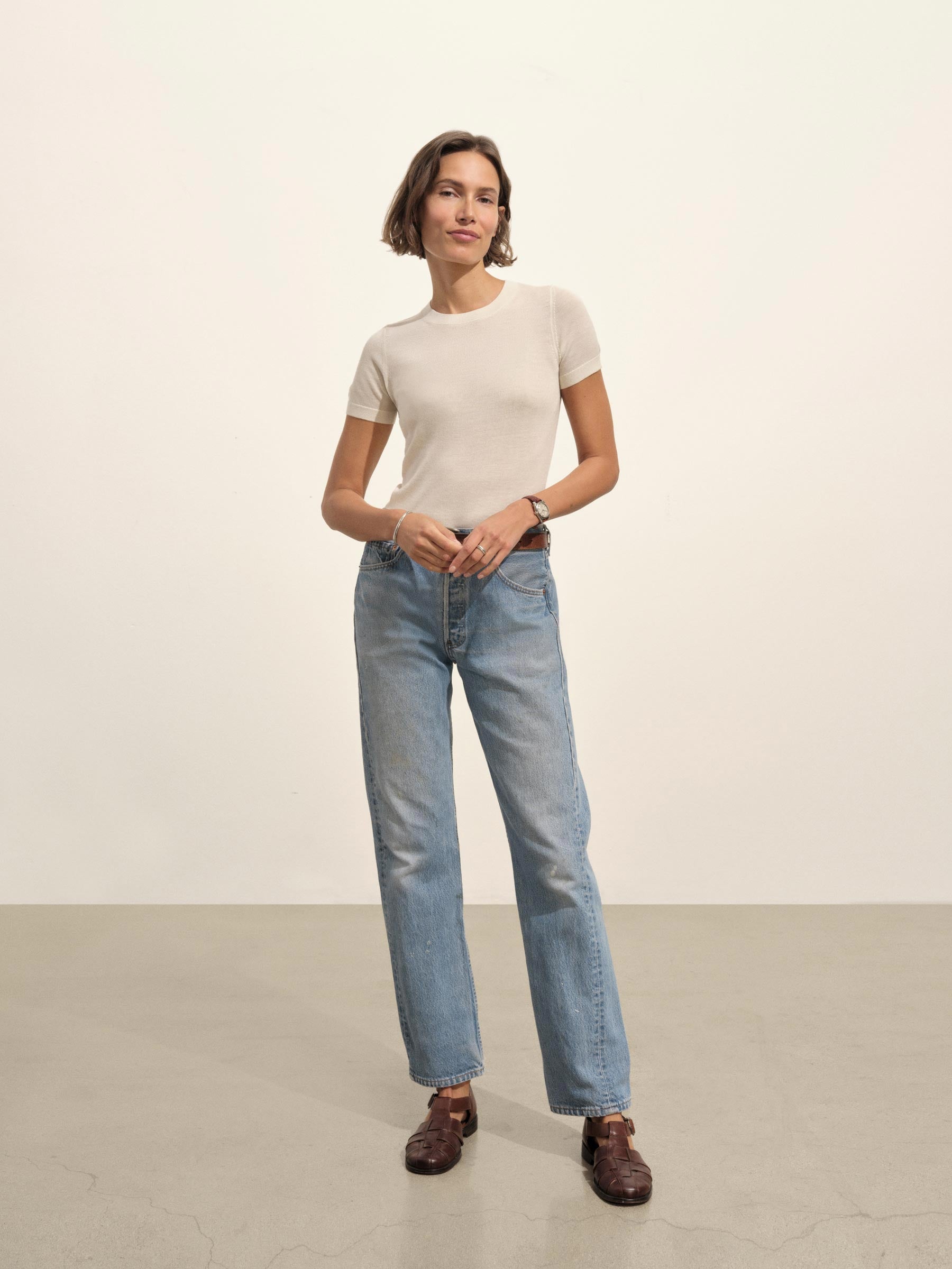 Sweater knit tee spun from a yarn-dyed blend of merino wool, silk, and cashmere.